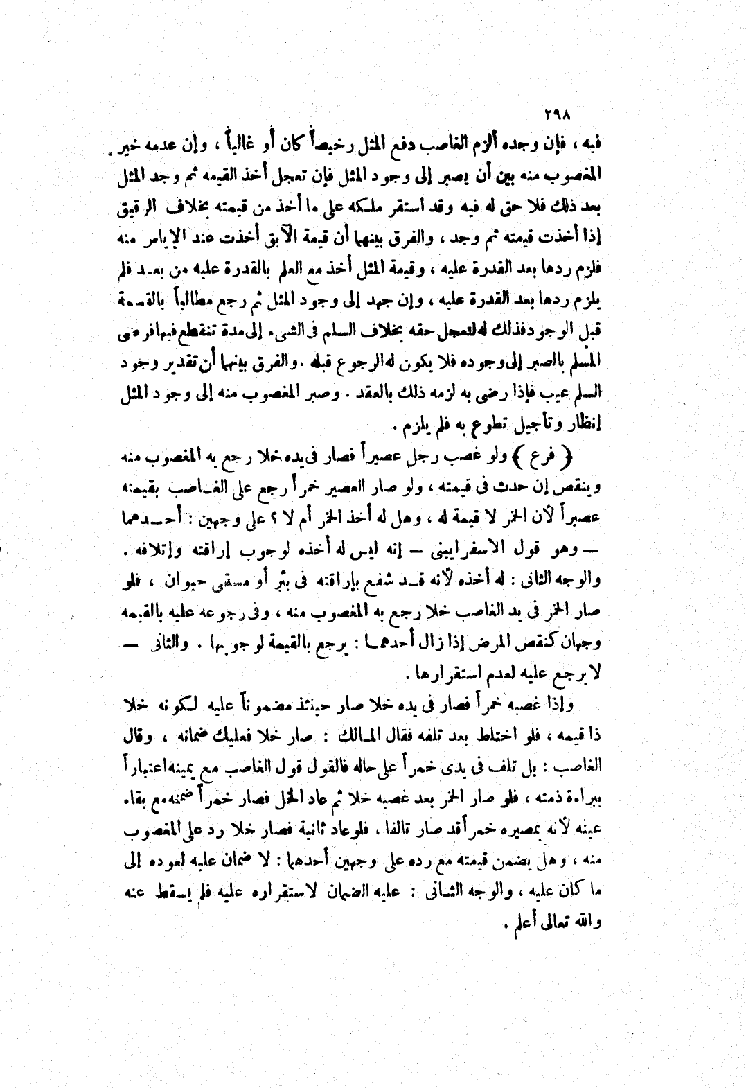 والوجه الثاني: له أخذه لانه قد شفع بإراقته في بئر أو مسقى حيوان، فلو صار الخمر في يد الغاصب خلا رجع به المغصوب منه، وفى رجوعه عليه بالقيمه وجهان كنقص المرض إذا زال أحدهما: يرجع بالقيمة لوجوبها.
