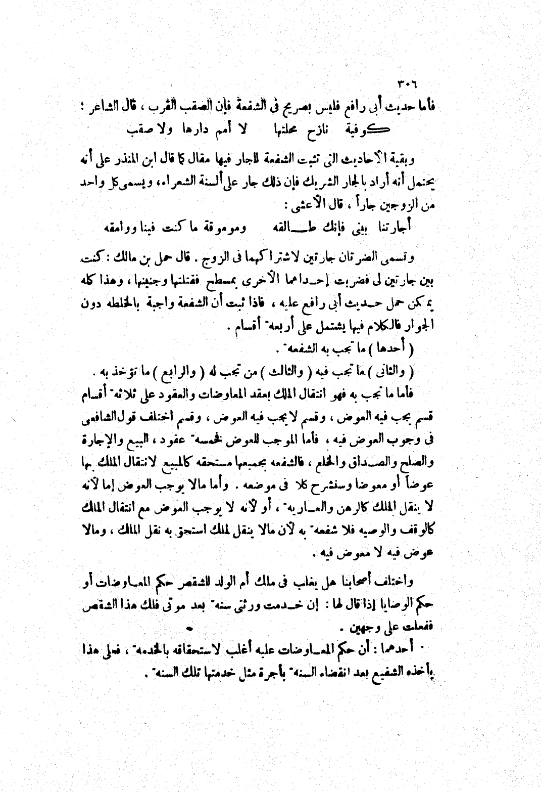 فأما ما تجب به فهو انتقال الملك بعقد المعاوضات والعقود على ثلاثة أقسام قسم يجب فيه العوض، وقسم لا يجب فيه العوض، وقسم اختلف قول الشافعي في وجوب العوض فيه، فأما الموجب للعوض فخمسة عقود، البيع والاجارة والصلح والصداق والخلع، فالشفعة بجميعها مستحقه كالمبيع لانتقال الملك بها عوضا أو معوضا وسنشرح كلا في موضعه.