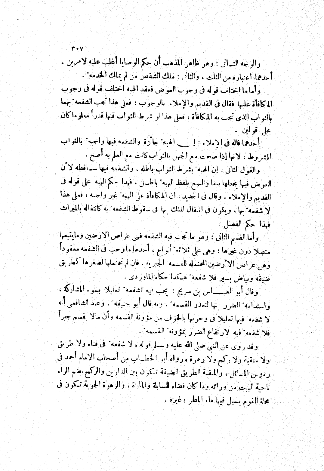وأما القسم الثاني: وهو ما تجب فيه الشفعه فهى عراص الارضين وما يتبعها متصلا دون غيرها، وهى على ثلاثة أنواع، أحدها ما وجب في الشفعه معقودا وهى عراص الارضين المحتمله للقسمة الجبريه، فان لم تحتملها لصغرها كطريق ضيقه وبياض يسير فلا شفعة هكذا حكاه الماوردى.
