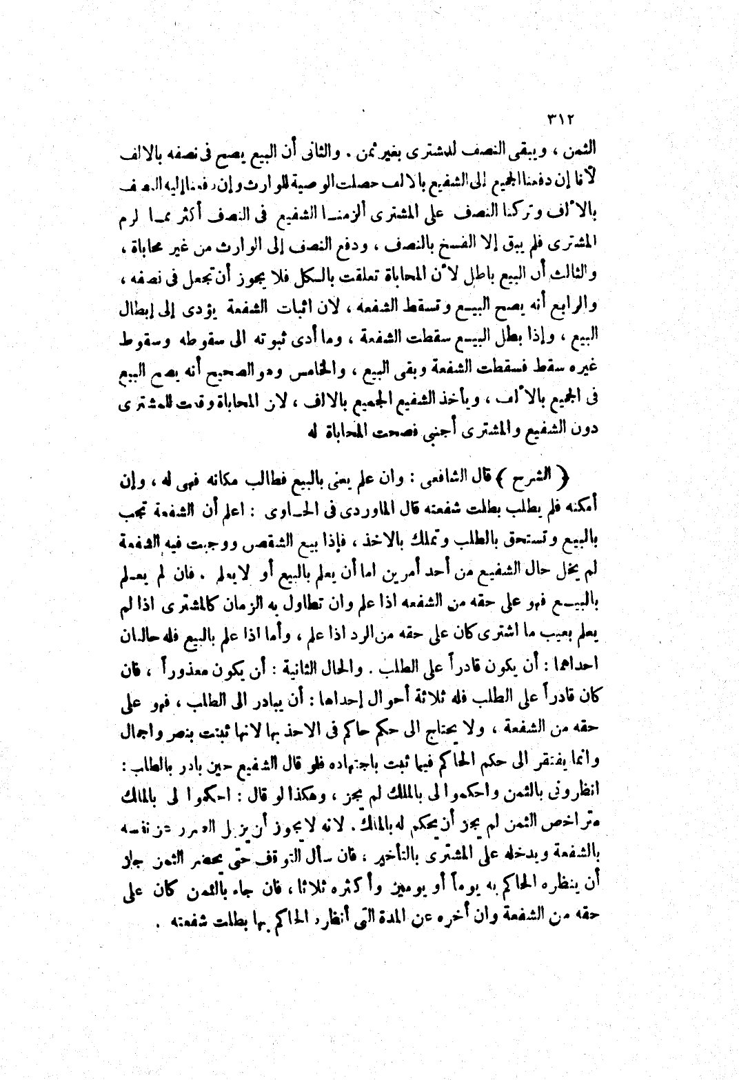 والثانى أن البيع يصح في نصفه بالالف لانا إن دفعنا الجميع إلى الشفيع بالالف حصلت الوصية للوارث وإن دفعنا إليه النصف بالالف وتركنا النصف على المشترى ألزمنا الشفيع في النصف أكثر مما لزم المشترى فلم يبق إلا الفسخ بالنصف، ودفع النصف إلى الوارث من غير محاباة، والثالث أن البيع باطل لان المحاباة تعلقت بالكل فلا يجوز أن تجعل في نصفه، والرابع أنه يصح البيع وتسقط الشفعه، لان اثبات الشفعة يؤدى إلى إبطال البيع، وإذا بطل البيع سقطت الشفعة، وما أدى ثبوته إلى سقوطه وسقوط غيره سقط فسقطت الشفعة وبقى البيع، والخامس وهو الصحيح أنه يصح البيع