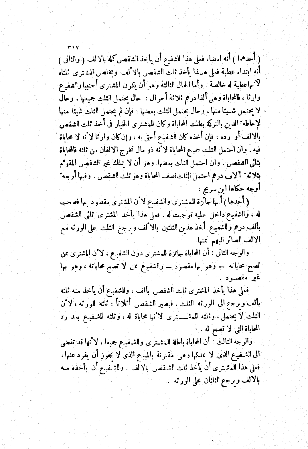 فعلى هذا يأخذ المشترى ثلثى الشقص بألف درهم وللشفيع أخذ هذين الثلثين بالالف ويرجع الثلث على الورثة مع الالف الصائر إليهم ثمنها والوجه الثاني: أن المحاباة جائزة للمشترى دون الشفيع، لان المشترى ممن تصح محاباته - وهو بها مقصود - والشفيع ممن لا تصح محاباته، وهو بها غير مقصود.