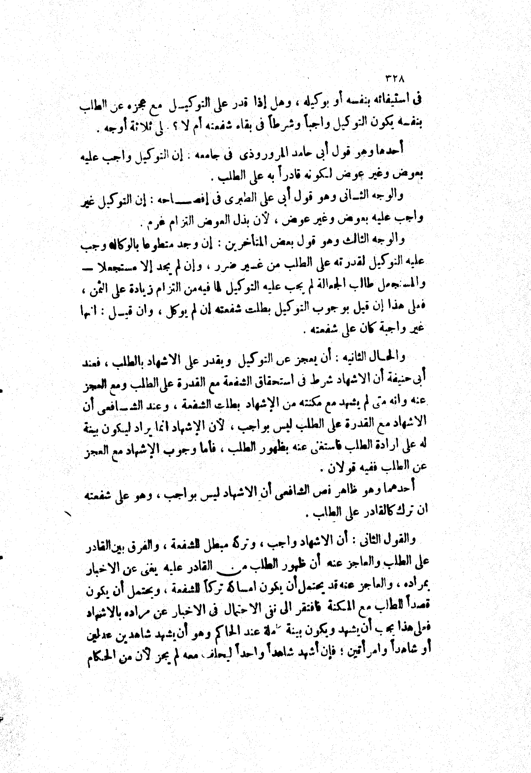في استيفائه بنفسه أو بوكيله، وهل إذا قدر على التوكيل مع عجزه عن الطلب بنفسه يكون التوكيل واجبا وشرطا في بقاء شفعته أم لا؟ عَلَى ثَلَاثَةِ أَوْجُهٍ.