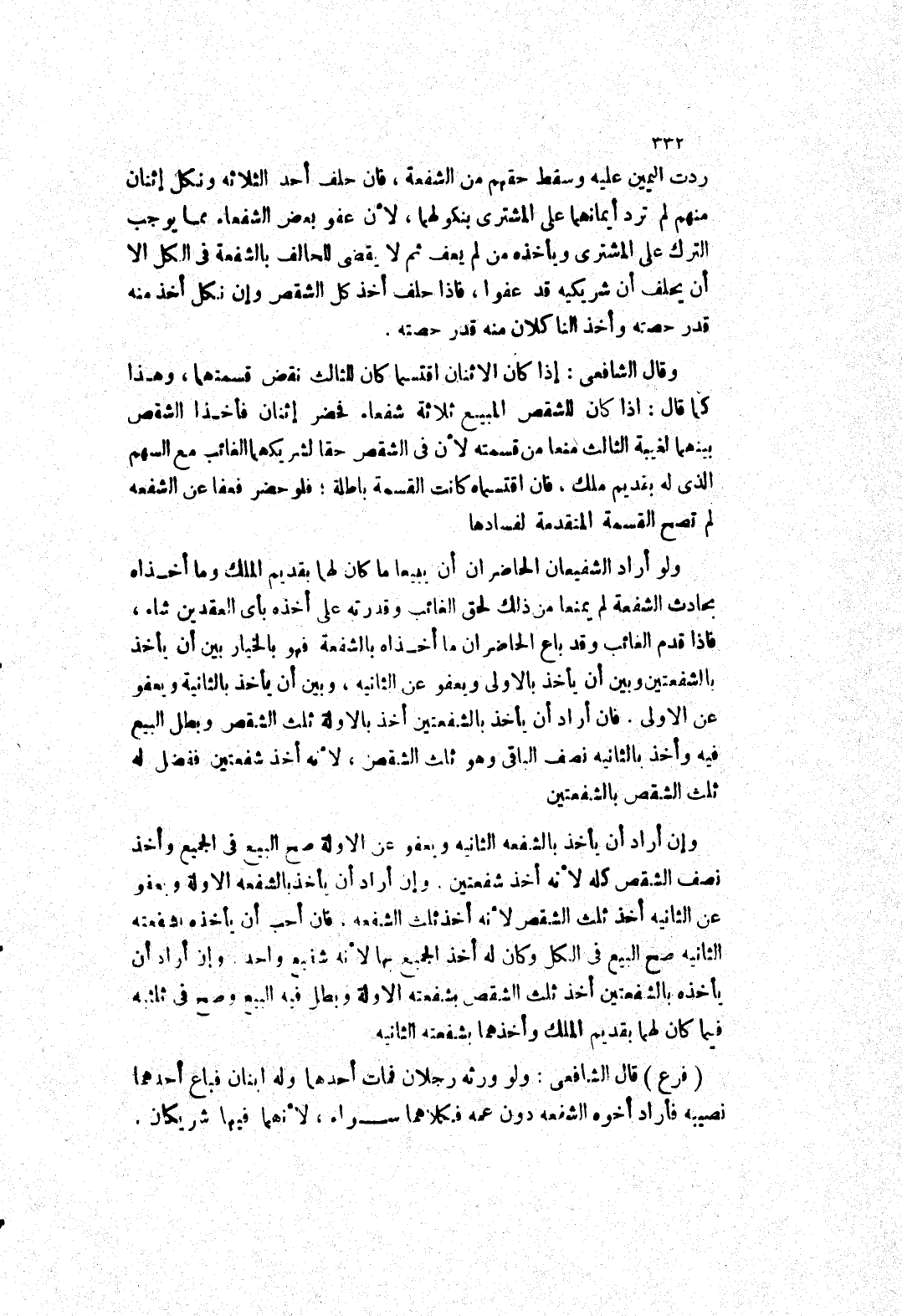 بحادث الشفعة لم يمنعا من ذلك لحق الغائب وقدرته على أخذه بأى العقدين شاء، فإذا قدم الغائب وقد باع الحاضران ما أخذاه بالشفعة فهو بالخيار بين أن يأخذ بالشفعتين وبين أن يأخذ بالاولى ويعفو عن الثانيه، وبين أن يأخذ بالثانية ويعفو عن الاولى.