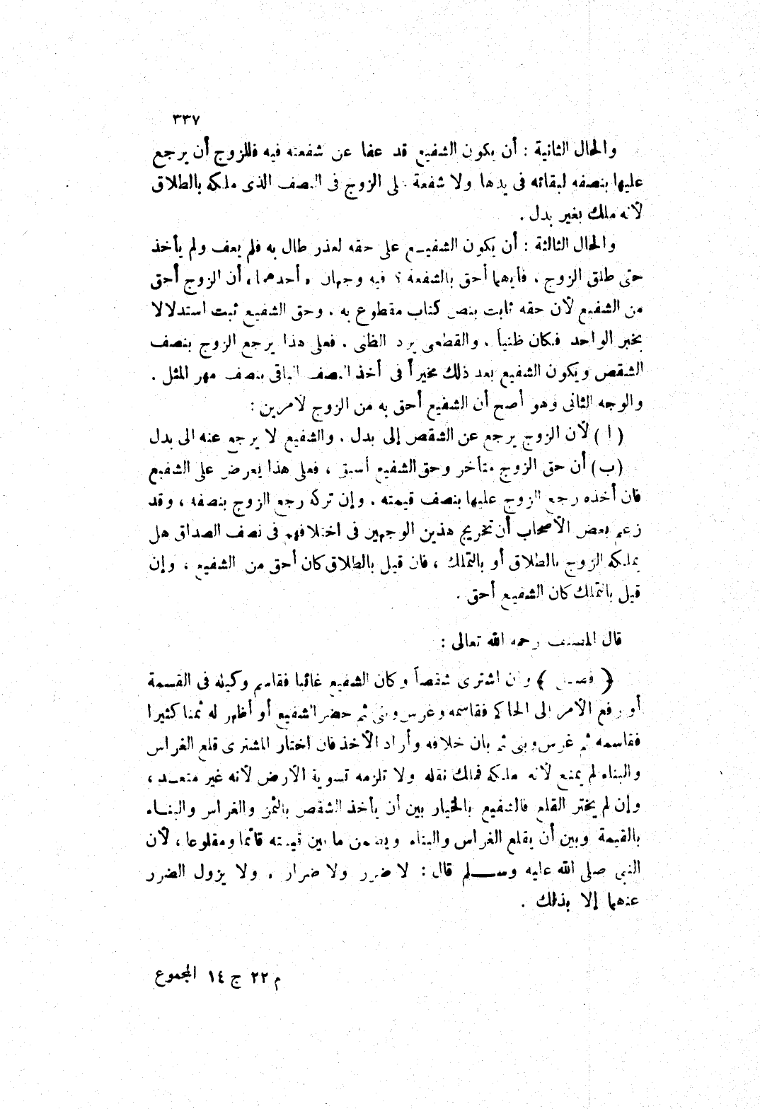 والحال الثانية: أن يكون الشفيع قد عفا عن شفعته فيه فللزوج أن يرجع عليها بنصفه لبقائه في يدها ولا شفعة على الزوج في النصف الذى ملكه بالطلاق لانه ملك بغير بدل.