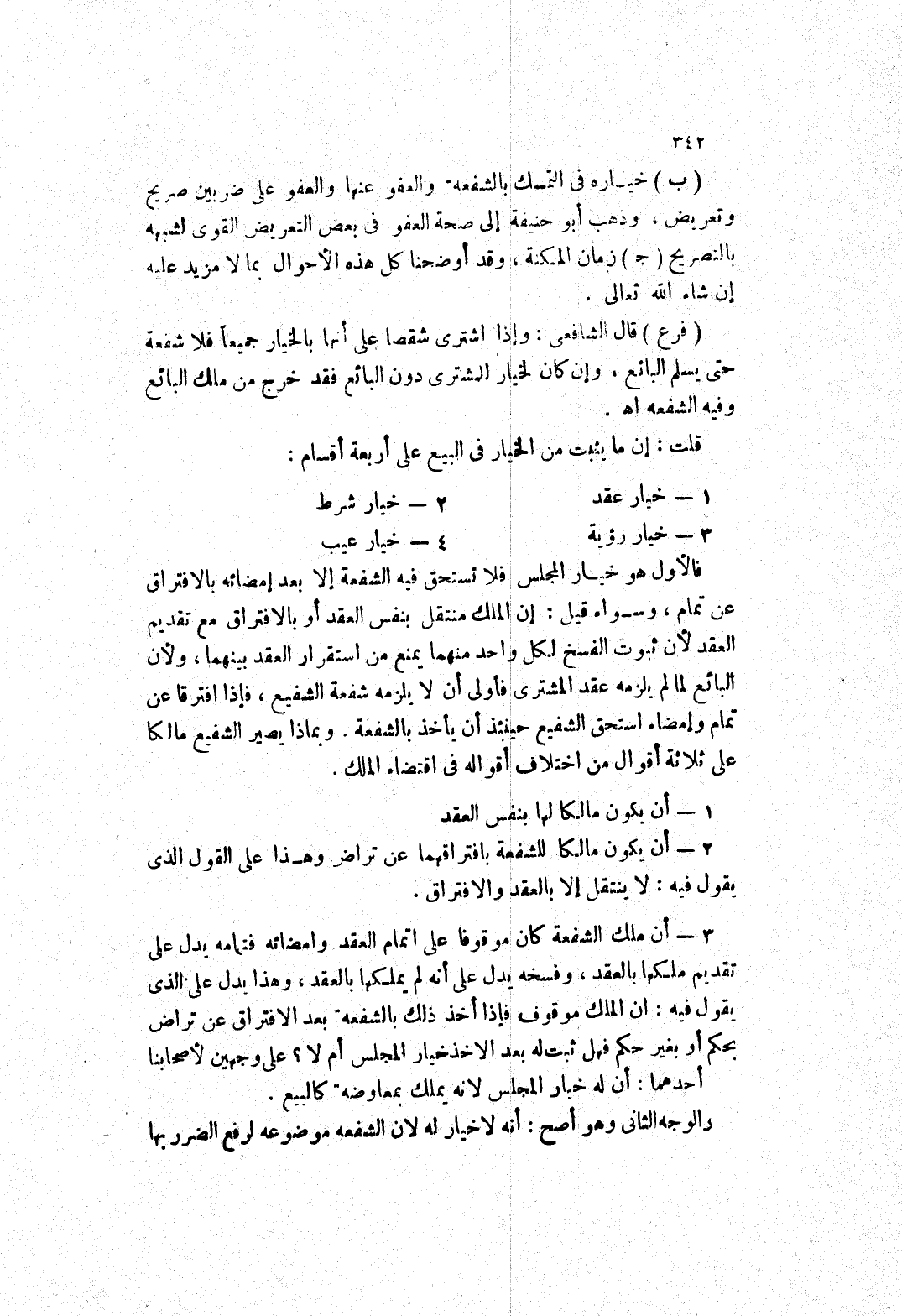 قلت: إن ما يثبت من الخيار في البيع على أربعة أقسام: 1 - خيار عقد 2 - خيار شرط 3 - خيار رؤية 4 - خيار عيب فالاول هو خيار المجلس فلا تستحق فيه الشفعة إلا بعد إمضائه بالافتراق عن تمام، وسواء قيل: إن الملك منتقل بنفس العقد أو بالافتراق مع تقديم العقد لان ثبوت الفسخ لكل واحد منهما يمنع من استقرار العقد بينهما، ولان البائع لما لم يلزمه عقد المشترى فأولى أن لا يلزمه شفعة الشفيع، فإذا افترقا عن تمام وإمضاء استحق الشفيع حينئذ أن يأخذ بالشفعة.