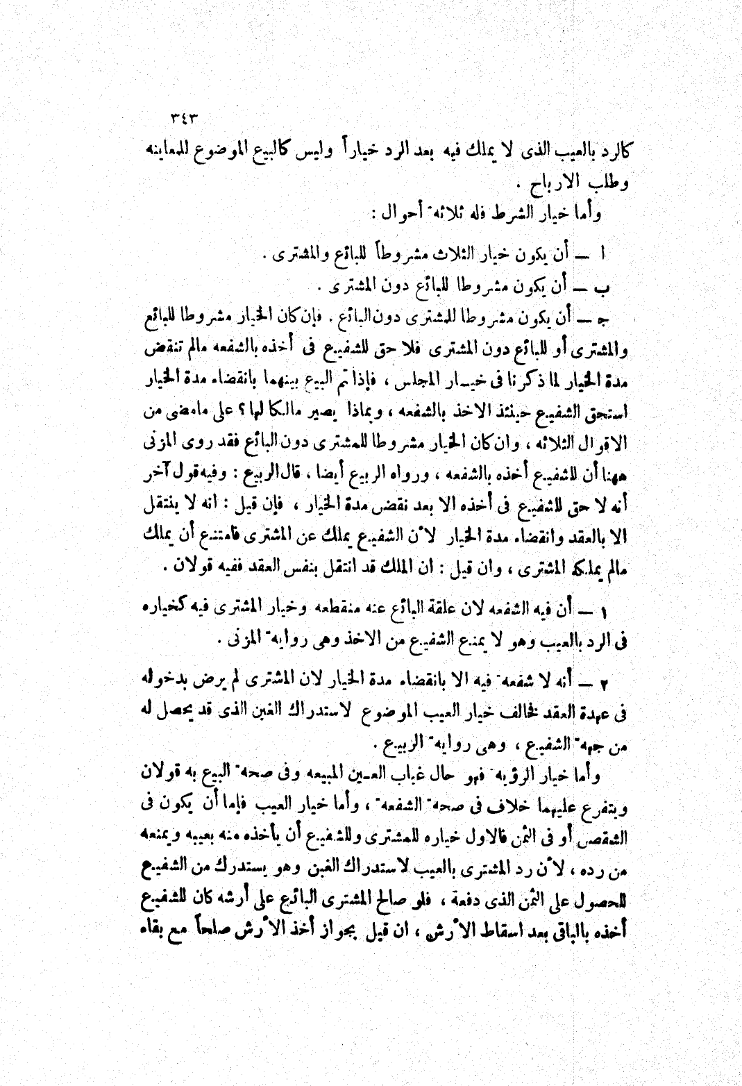 ج - أن يكون مشروطا للمشترى دون البائع، فإن كان الخيار مشروطا للبائع والمشترى أو للبائع دون المشترى فلا حق للشفيع في أخذه بالشفعه ما لم تنقض مدة الخيار لما ذكرنا في خيار المجلس، فإذا تم البيع بينهما بانقضاء مدة الخيار استحق الشفيع حينئذ الاخذ بالشفعه، وبماذا يصير مالكا لها؟ على ما مضى من الاقوال الثلاثه، وان كان الخيار مشروطا للمشترى دون البائع فقد روى المزني ههنا أن للشفيع أخذه بالشفعه، ورواه الربيع أيضا، قَالَ الرَّبِيعُ: وَفِيهِ قَوْلٌ آخَرُ أَنَّهُ لَا حق للشفيع في أخذه الا بعد نقض مدة الخيار، فإن قيل: انه لا ينتقل
