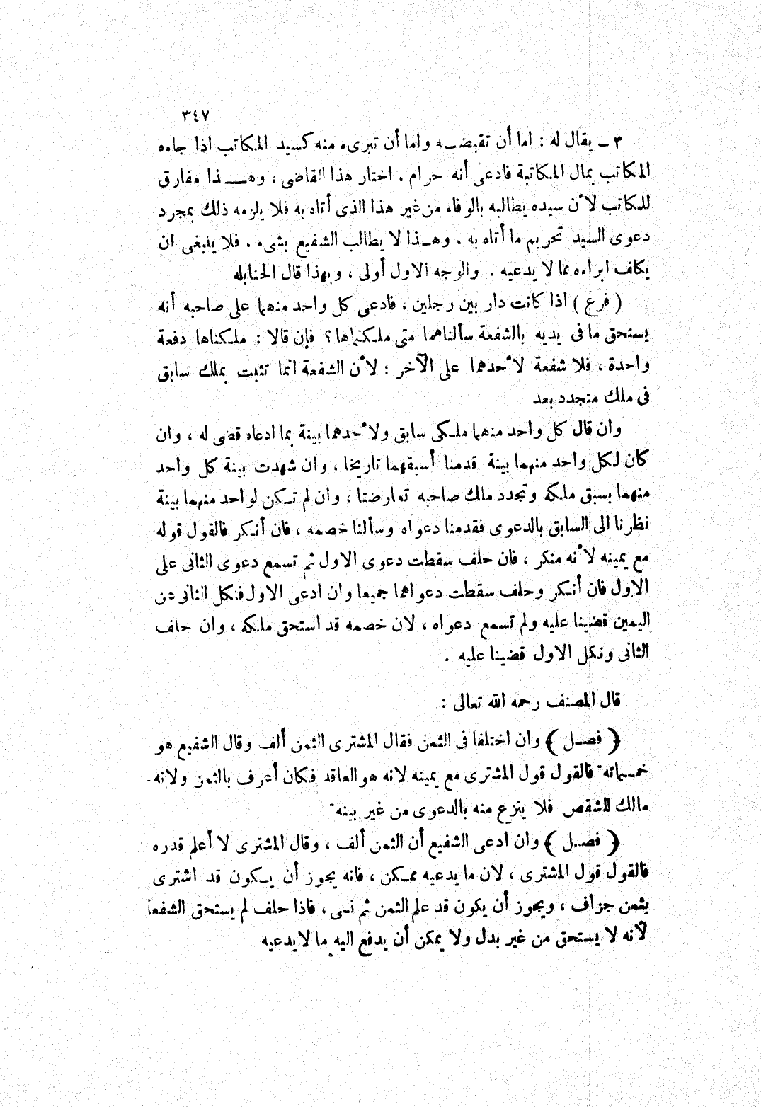 3 - يقال له: اما أن تقبضه واما أن تبرئ منه كسيد المكاتب إذا جاءه المكاتب بمال المكاتبة فادعى أنه حرام، اختار هذا القاضى، وهذا مفارق للمكاتب لان سيده يطالبه بالوفاء من غير هذا الذى أتاه به فلا يلزمه ذلك بمجرد دعوى السيد تحريم ما أتاه به، وهذا لا يطالب الشفيع بشئ، فلا ينبغى ان يكلف ابراءه مما لا يدعيه.