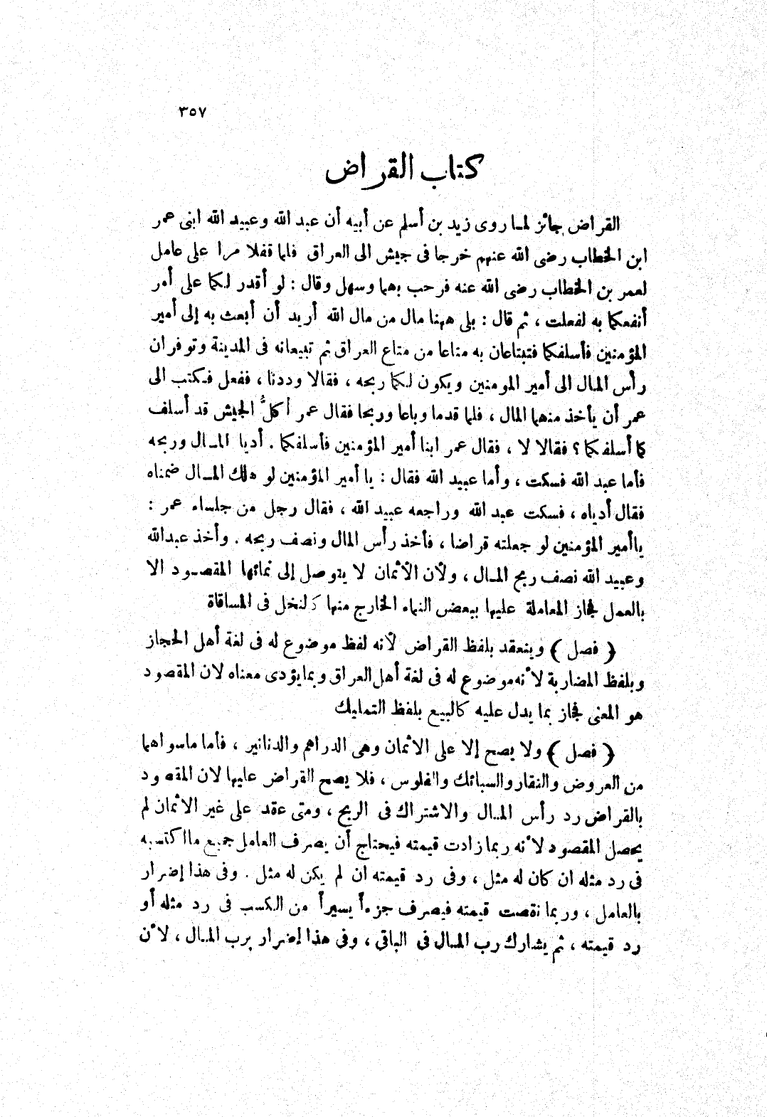 القراض جائز لما روى زيد بن أسلم عن أبيه أن عبد الله وعبيد الله ابني عمر ابن الخطاب رضى الله عنهم خرجا في جيش إلى العراق فلما قفلا مرا على عامل لعمر بن الخطاب رضى الله عنه فرحب بهما وسهل وقال: لو أقدر لكما على أمر أنفعكما به لفعلت، ثم قال: بلى ههنا مال من مال الله أريد أن أبعث به إلى أمير المؤمنين فأسلفكما فتبتاعان به متاعا من متاع العراق ثم تبيعانه في المدينة وتوفران رأس المال إلى أمير المومنين ويكون لكما ربحه، فقالا وددنا، ففعل فكتب إلى عمر أن يأخذ منهما المال، فلما قدما وباعا وربحا فقال عمر أكل الجيش قد أسلف كما أسلفكما؟ فقالا لا، فقال عمر ابنا أمير المؤمنين فأسلفكما.
