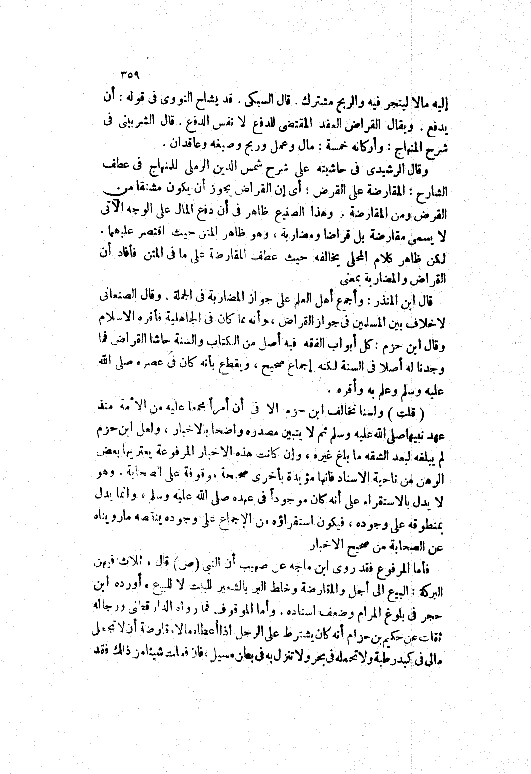 (قلت) ولسنا نخالف ابن حزم الا في أن أمرا مجمعا عليه من الامة منذ عهد نبيها صلى الله عليه وسلم ثم لا يتبين مصدره واضحا بالاخبار، ولعل ابن حزم لم يبلغه لبعد الشقه ما بلغ غيره، وإن كانت هذه الاخبار المرفوعة يعتريها بعض الوهن من ناحية الاسناد فانها مؤيدة بأخرى صحيحة موقوفة على الصحابة، وهو لا يدل بالاستقراء على أنه كان موجودا في عهده صلى الله عليه وسلم، وانما يدل بمنطوقه على وجوده، فيكون استقراؤه من الاجماع على وجوده ينقصه ما رويناه عن الصحابة من صحيح الاخبار فأما المرفوع فقد روى ابن ماجه عن صهيب إنَّ النَّبِيَّ صَلَّى اللَّهُ عَلَيْهِ وَسَلَّمَ قَالَ " ثلاث فيهن البركة: البيع إلى أجل والمقارضة وخلط البر بالشعير للبيت لا للبيع " أورده ابن حجر في بلوغ المرام وضعف اسناده.