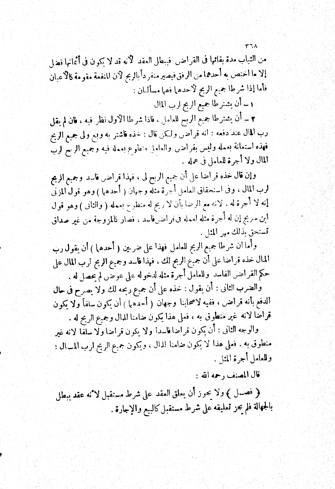 من الثياب مدة بقائها في القراض فيبطل العقد لانه قد لا يكون في أثمانها فضل إلا ما اختص به أحدهما من الرفق فيصير منفردا بالربح لان المنفعة مقومة كالاعيان فأما إذا شرطا جميع الربح لاحدهما فهما مسألتان: 1 - أن يشترطا جميع الربح لرب المال 2 - أن يشترطا جميع الربح للعامل، فإذا شرطا الاول نظر فيه، فان لم يقل رب المال عند دفعه: انه قراض ولكن قال: خذه فاشتر به وبع ولى جميع الربح فهذه استعانة بعمله وليس بقراض والعامل متطوع بعمله فيه وجميع الربح لرب المال ولا أجرة للعامل في عمله.