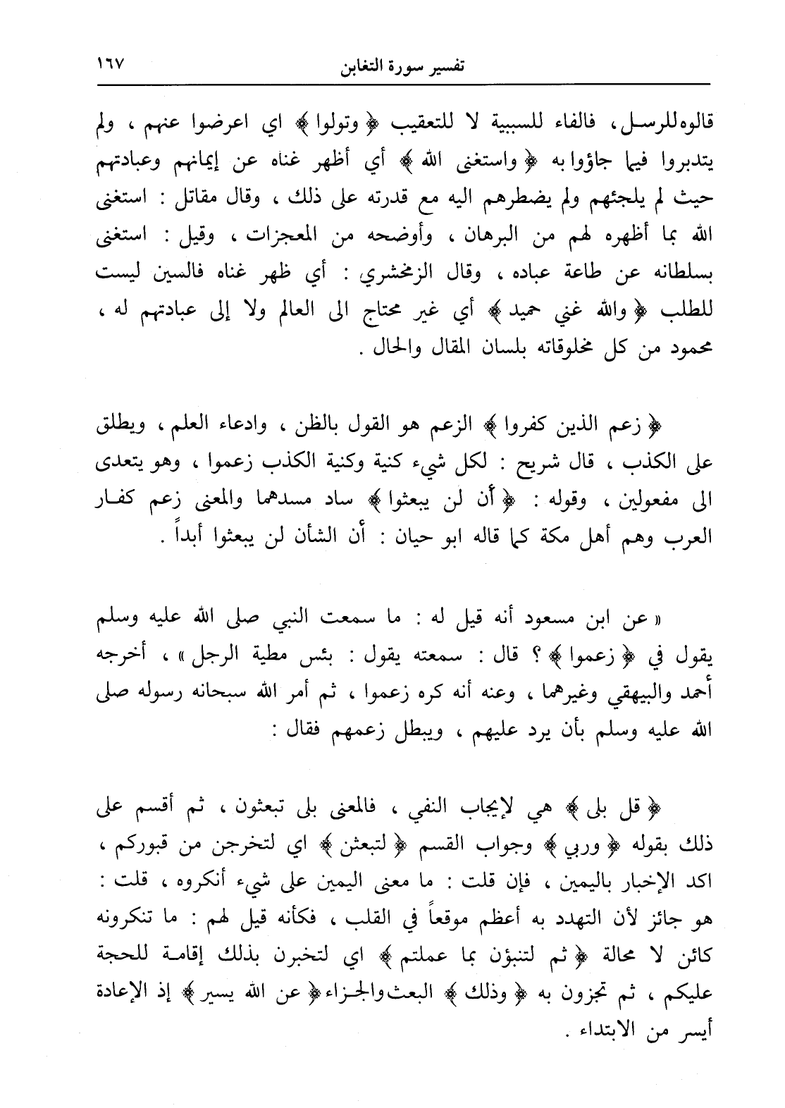 " عن ابن مسعود أنه قيل له: ما سمعت النبي صلى الله عليه وسلم يقول في (زعموا)؟ قال: سمعته يقول: بئس مطية الرجل "، أخرجه أحمد والبيهقي وغيرهما، وعنه أنه كره زعموا، ثم أمر الله سبحانه رسوله صلى الله عليه وسلم بأن يرد عليهم، ويبطل زعمهم فقال: