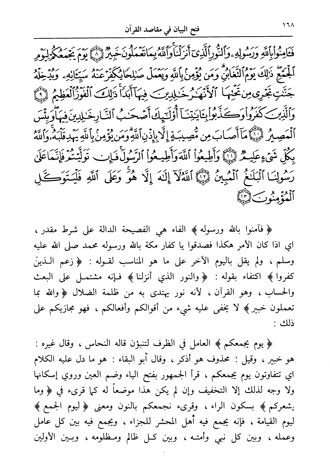 فَآمِنُوا بِاللَّهِ وَرَسُولِهِ وَالنُّورِ الَّذِي أَنْزَلْنَا وَاللَّهُ بِمَا تَعْمَلُونَ خَبِيرٌ (8) يَوْمَ يَجْمَعُكُمْ لِيَوْمِ الْجَمْعِ ذَلِكَ يَوْمُ التَّغَابُنِ وَمَنْ يُؤْمِنْ بِاللَّهِ وَيَعْمَلْ صَالِحًا يُكَفِّرْ عَنْهُ سَيِّئَاتِهِ وَيُدْخِلْهُ جَنَّاتٍ تَجْرِي مِنْ تَحْتِهَا الْأَنْهَارُ خَالِدِينَ فِيهَا أَبَدًا ذَلِكَ الْفَوْزُ الْعَظِيمُ (9) وَالَّذِينَ كَفَرُوا وَكَذَّبُوا بِآيَاتِنَا أُولَئِكَ أَصْحَابُ النَّارِ خَالِدِينَ فِيهَا وَبِئْسَ الْمَصِيرُ (10) مَا أَصَابَ مِنْ مُصِيبَةٍ إِلَّا بِإِذْنِ اللَّهِ وَمَنْ يُؤْمِنْ بِاللَّهِ يَهْدِ قَلْبَهُ وَاللَّهُ بِكُلِّ شَيْءٍ عَلِيمٌ (11) وَأَطِيعُوا اللَّهَ وَأَطِيعُوا الرَّسُولَ فَإِنْ تَوَلَّيْتُمْ فَإِنَّمَا عَلَى رَسُولِنَا الْبَلَاغُ الْمُبِينُ (12) اللَّهُ لَا إِلَهَ إِلَّا هُوَ وَعَلَى اللَّهِ فَلْيَتَوَكَّلِ الْمُؤْمِنُونَ (13)