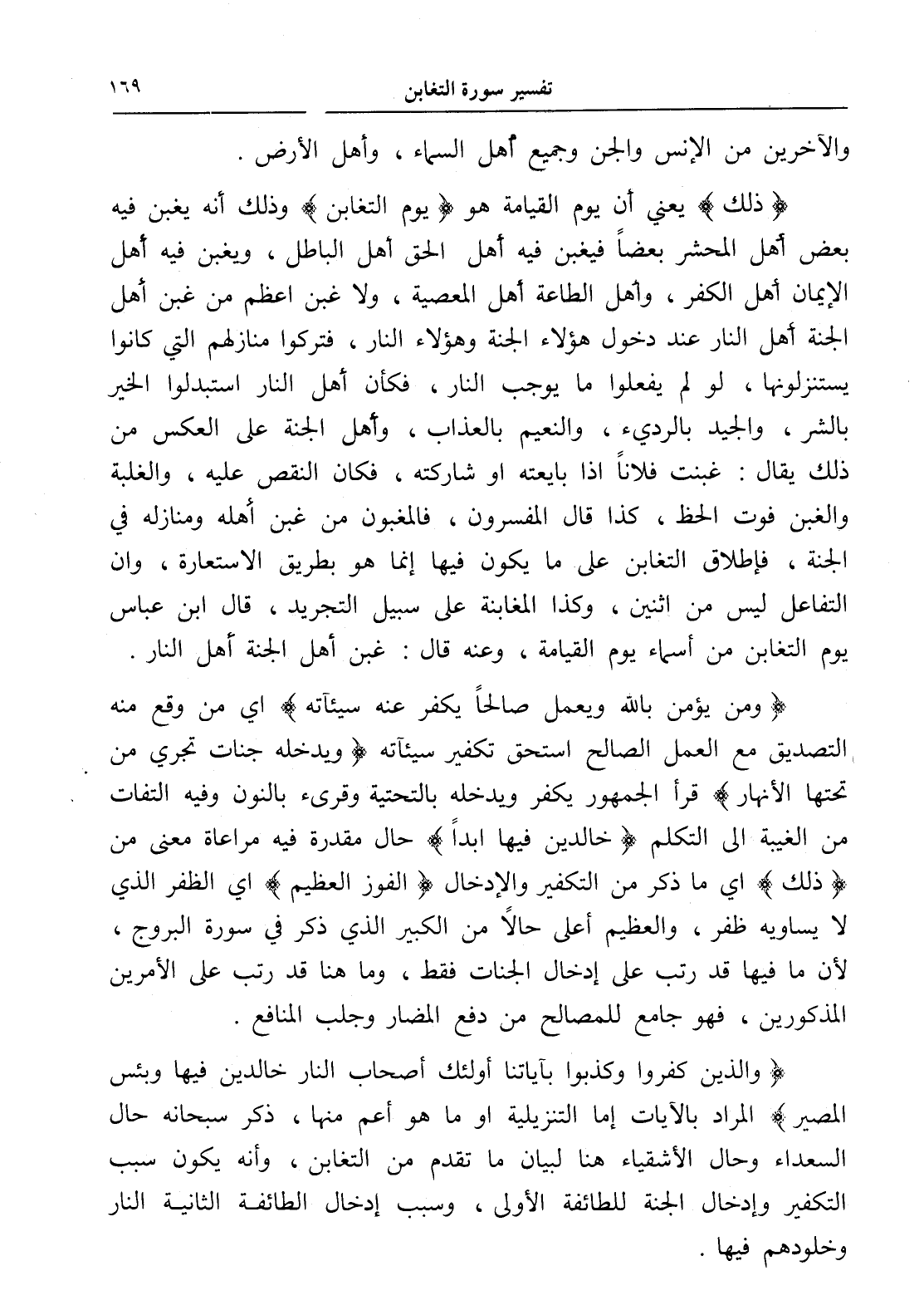 (ذلك) يعني أن يوم القيامة هو (يوم التغابن) وذلك أنه يغبن فيه بعض أهل المحشر بعضاً فيغبن فيه أهل الحق أهل الباطل، ويغبن فيه أهل الإيمان أهل الكفر، وأهل الطاعة أهل المعصية، ولا غبن أعظم من غبن أهل الجنة أهل النار عند دخول هؤلاء الجنة وهؤلاء النار، فتركوا منازلهم التي كانوا يستنزلونها، لو لم يفعلوا ما يوجب النار، فكأن أهل النار استبدلوا الخير بالشر، والجيد بالرديء، والنعيم بالعذاب، وأهل الجنة على العكس من ذلك يقال: غبنت فلاناً إذا بايعته أو شاركته، فكان النقص عليه، والغلبة والغبن فوت الحظ، كذا قال المفسرون، فالمغبون من غبن أهله ومنازله في الجنة، فإطلاق التغابن على ما يكون فيها إنما هو بطريق الاستعارة، وإن التفاعل ليس من اثنين، وكذا المغابنة على سبيل التجريد، قال ابن عباس يوم التغابن من أسماء يوم القيامة، وعنه قال: غبن أهل الجنة أهل النار.