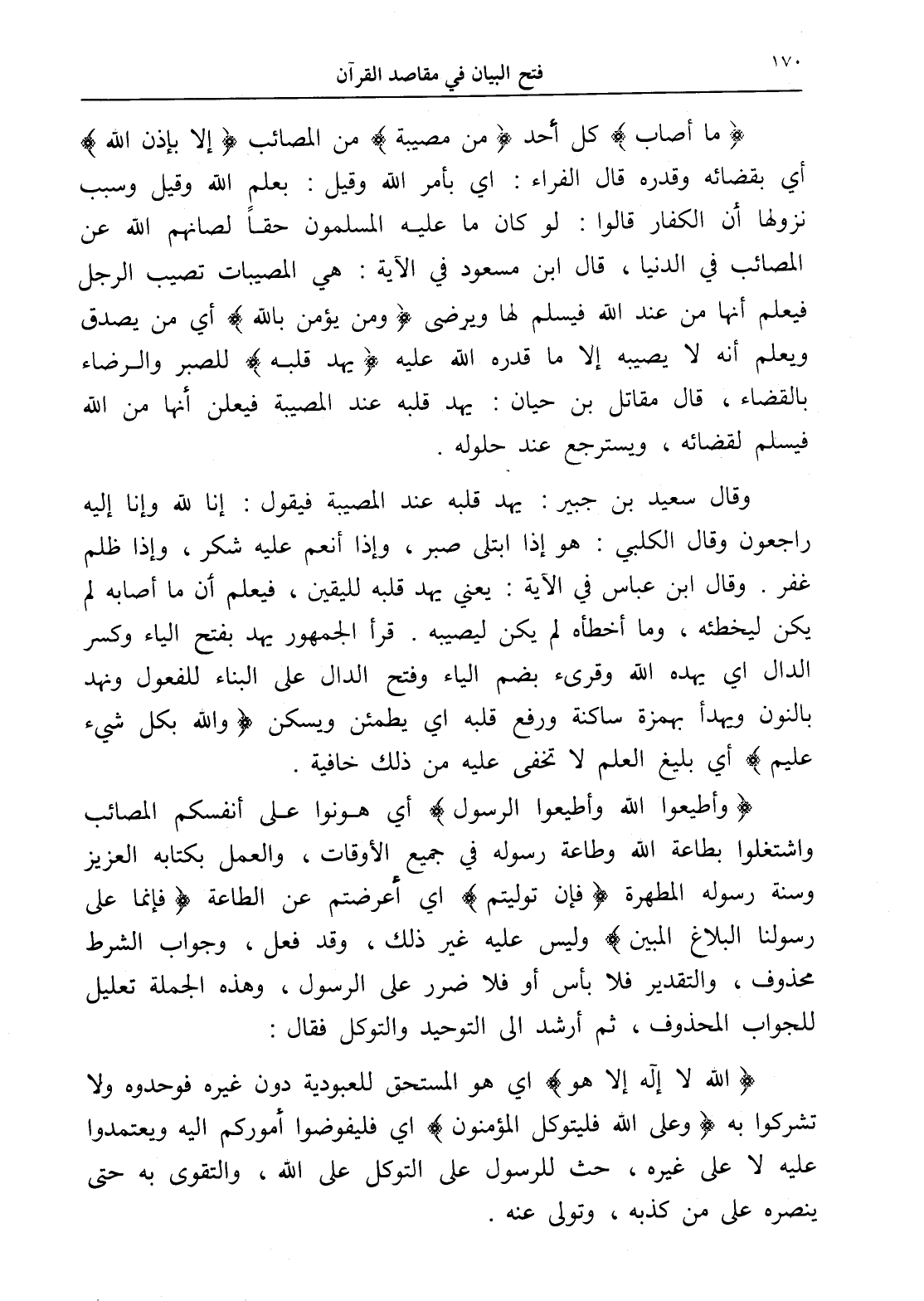 (ما أصاب) كل أحد (من مصيبة) من المصائب (إلا بإذن الله) أي بقضائه وقدره قال الفراء: أي بأمر الله وقيل: بعلم الله وقيل وسبب نزولها أن الكفار قالوا: لو كان ما عليه المسلمون حقاً لصانهم الله عن المصائب في الدنيا، قال ابن مسعود في الآية: هي المصيبات تصيب الرجل فيعلم أنها من عند الله فيسلم لها ويرضى (ومن يؤمن بالله) أي من يصدق ويعلم أنه لا يصيبه إلا ما قدره الله عليه (يهد قلبه) للصبر والرضاء بالقضاء، قال مقاتل بن حيان: يهد قلبه عند المصيبة فيعلم أنها من الله فيسلم لقضائه، ويسترجع عند حلوله.