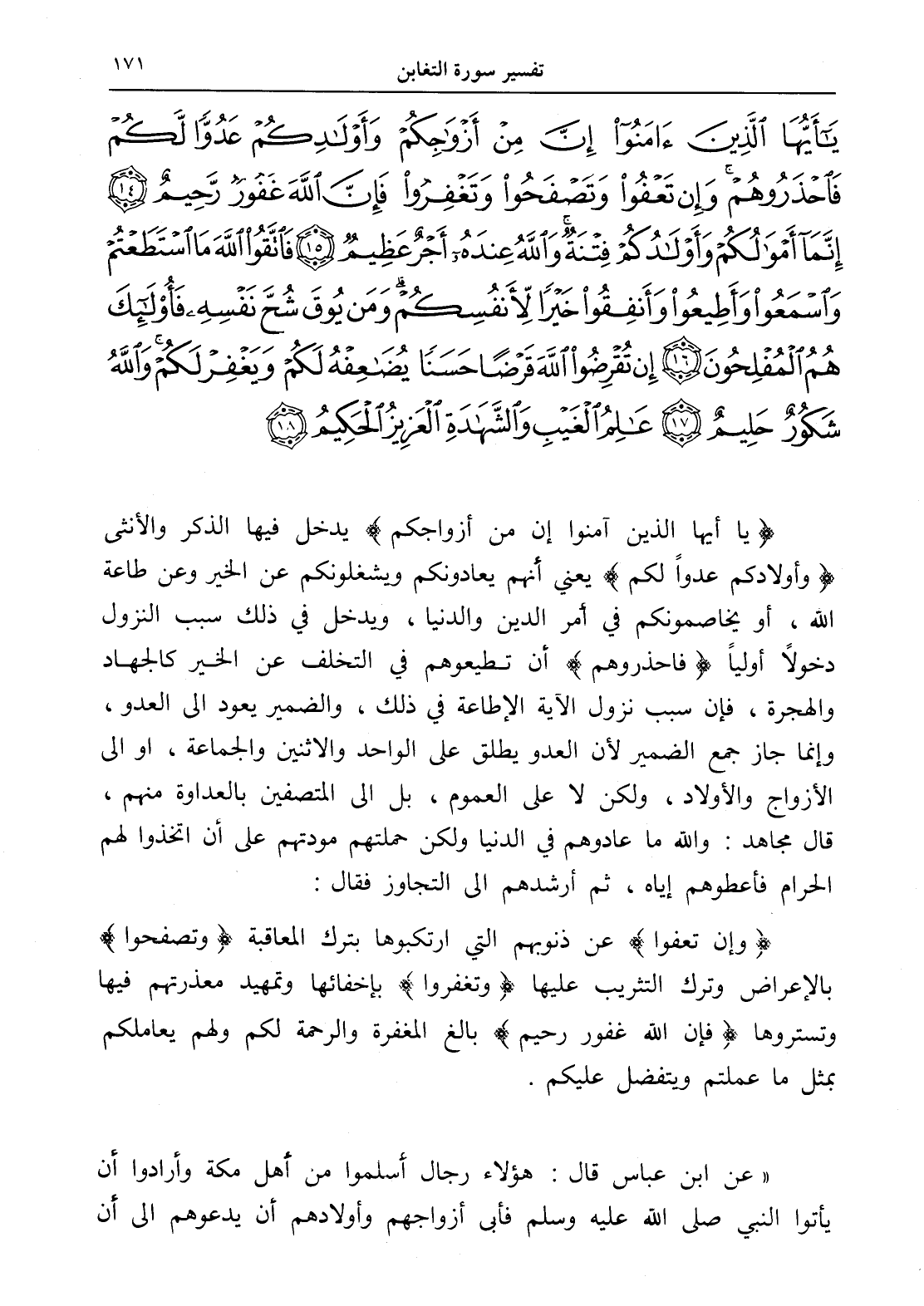 يَا أَيُّهَا الَّذِينَ آمَنُوا إِنَّ مِنْ أَزْوَاجِكُمْ وَأَوْلَادِكُمْ عَدُوًّا لَكُمْ فَاحْذَرُوهُمْ وَإِنْ تَعْفُوا وَتَصْفَحُوا وَتَغْفِرُوا فَإِنَّ اللَّهَ غَفُورٌ رَحِيمٌ (14) إِنَّمَا أَمْوَالُكُمْ وَأَوْلَادُكُمْ فِتْنَةٌ وَاللَّهُ عِنْدَهُ أَجْرٌ عَظِيمٌ (15) فَاتَّقُوا اللَّهَ مَا اسْتَطَعْتُمْ وَاسْمَعُوا وَأَطِيعُوا وَأَنْفِقُوا خَيْرًا لِأَنْفُسِكُمْ وَمَنْ يُوقَ شُحَّ نَفْسِهِ فَأُولَئِكَ هُمُ الْمُفْلِحُونَ (16) إِنْ تُقْرِضُوا اللَّهَ قَرْضًا حَسَنًا يُضَاعِفْهُ لَكُمْ وَيَغْفِرْ لَكُمْ وَاللَّهُ شَكُورٌ حَلِيمٌ (17) عَالِمُ الْغَيْبِ وَالشَّهَادَةِ الْعَزِيزُ الْحَكِيمُ (18)