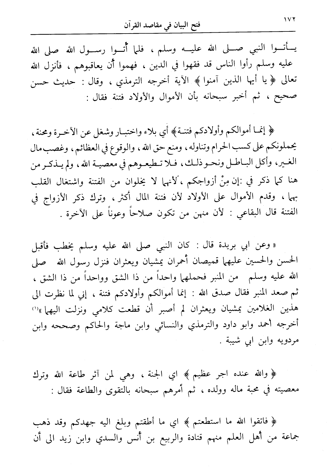 " وعن أبي بريدة قال: كان النبي صلى الله عليه وسلم يخطب فأقبل الحسن والحسين عليهما قميصان أحمران يمشيان ويعثران فنزل رسول الله صلى الله عليه وسلم من المنبر فحملهما واحداً من ذا الشق وواحداً من ذا الشق، ثم صعد المنبر فقال صدق الله: إنما أموالكم وأولادكم فتنة، إني لما نظرت إلى هذين الغلامين يمشيان ويعثران لم أصبر أن قطعت كلامي ونزلت إليهما " (1) أخرجه أحمد وأبو داود والترمذي والنسائي وابن ماجة والحاكم وصححه وابن مردويه وابن أبي شيبة.