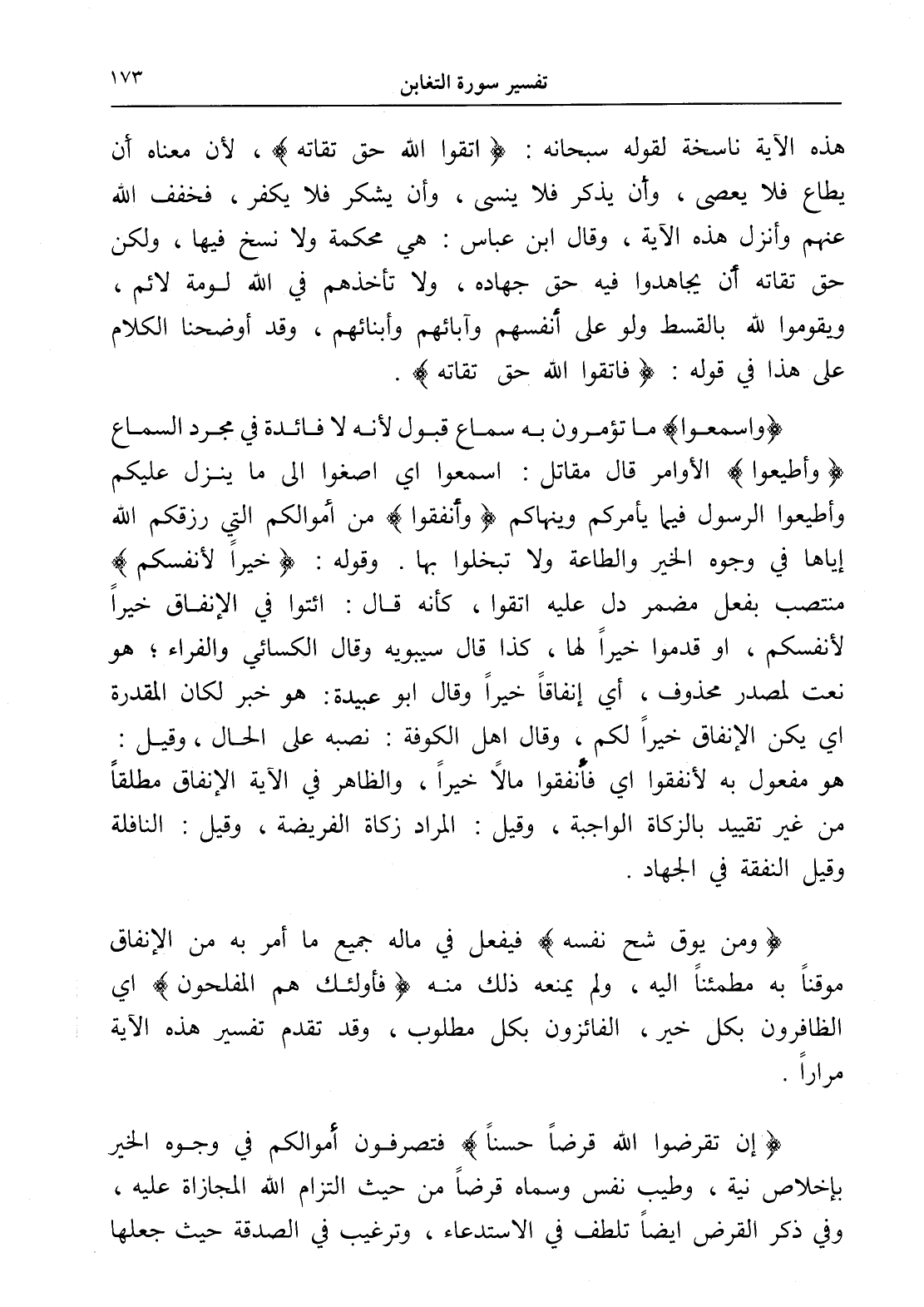 هذه الآية ناسخة لقوله سبحانه: (اتَّقُوا اللَّهَ حَقَّ تُقَاتِهِ)، لأن معناه أن يطاع فلا يعصى، وأن يذكر فلا ينسى، وأن يشكر فلا يكفر، فخفف الله عنهم وأنزل هذه الآية، وقال ابن عباس: هي محكمة ولا نسخ فيها، ولكن حق تقاته أن يجاهدوا فيه حق جهاده، ولا تأخذهم في الله لومة لائم، ويقوموا لله بالقسط ولو على أنفسهم وآبائهم وأبنائهم، وقد أوضحنا الكلام على هذا في قوله: (اتَّقُوا اللَّهَ حَقَّ تُقَاتِهِ).