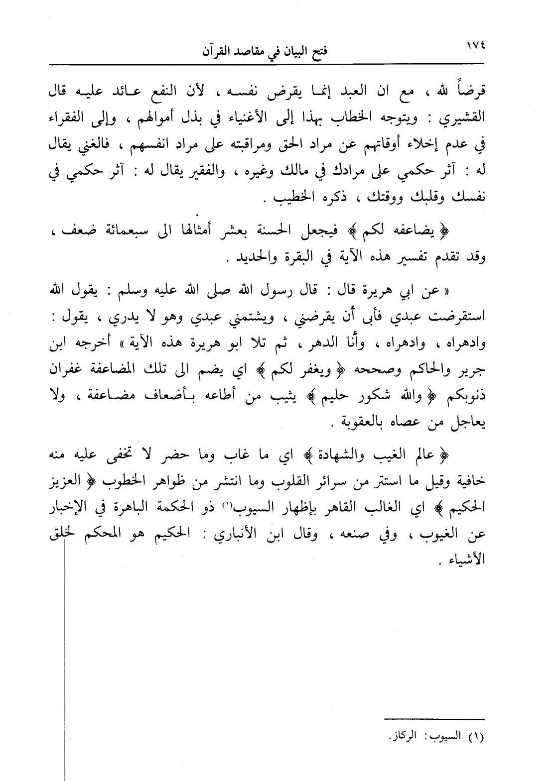" عن أبي هريرة قال: قال رسول الله صلى الله عليه وسلم: يقول الله استقرضت عبدي فأبى أن يقرضني، ويشتمني عبدي وهو لا يدري، يقول: وادهراه، وادهراه، وأنا الدهر، ثم تلا أبو هريرة هذه الآية " أخرجه ابن جرير والحاكم وصححه (ويغفر لكم) أي يضم إلى تلك المضاعفة غفران ذنوبكم (والله شكور حليم) يثيب من أطاعه بأضعاف مضاعفة، ولا يعاجل من عصاه بالعقوبة.