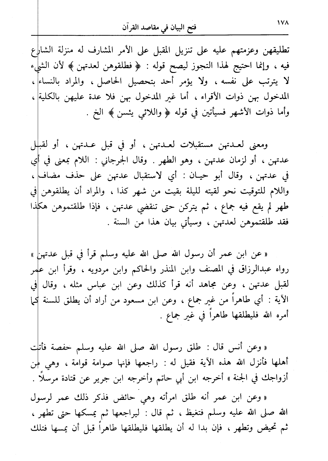 " عن ابن عمر أن رسول الله صلى الله عليه وسلم قرأ في قبل عدتهن " رواه عبد الرزاق في المصنف وابن المنذر والحاكم وابن مردويه، وقرأ ابن لقبل عدتهن، وعن مجاهد أنه قرأ كذلك وعن ابن عباس مثله، وقال في الآية: أي طاهراً من غير جماع، وعن ابن مسعود من أراد أن يطلق للسنة كما أمره الله فليطلقها طاهراً في غير جماع.