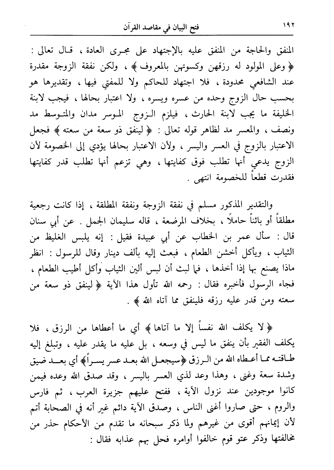 والتقدير المذكور مسلم في نفقة الزوجة ونفقة المطلقة، إذا كانت رجعية مطلقاً أو بائناً حاملاً، بخلاف المرضعة، قاله سليمان الجمل. عن أبي سنان قال: سأل عمر بن الخطاب عن أبي عبيدة فقيل: إنه يلبس الغليظ من الثياب، ويأكل أخشن الطعام، فبعث إليه بألف دينار وقال للرسول: انظر ماذا يصنع بها إذا أخذها، فما لبث أن لبس ألين الثياب وأكل أطيب الطعام، فجاء الرسول فأخبره فقال: رحمه الله تأول هذا الآية (لينفق ذو سعة من سعته ومن قدر عليه رزقه فلينفق مما آتاه الله).