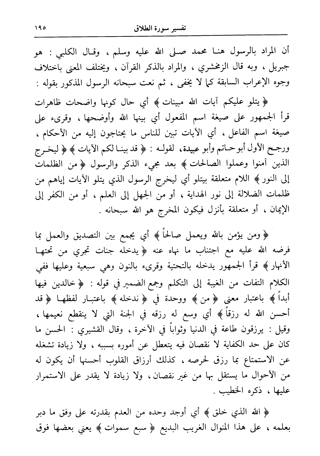 (يتلو عليكم آيات الله مبينات) أي حال كونها واضحات ظاهرات قرأ الجمهور على صيغة اسم المفعول أي بينها الله وأوضحها، وقرىء على صيغة اسم الفاعل، أي الآيات تبين للناس ما يحتاجون إليه من الأحكام، ورجح الأول أبو حاتم وأبو عبيدة، لقوله: (قد بينا لكم الآيات) (ليخرج الذين آمنوا وعملوا الصالحات) بعد مجيء الذكر والرسول (من الظلمات إلى النور) اللام متعلقة بيتلو أي ليخرج الرسول الذي يتلو الآيات إياهم من ظلمات الضلالة إلى نور الهداية، أو من الجهل إلى العلم، أو من الكفر إلى الإيمان، أو متعلقة بأنزل فيكون المخرج هو الله سبحانه.