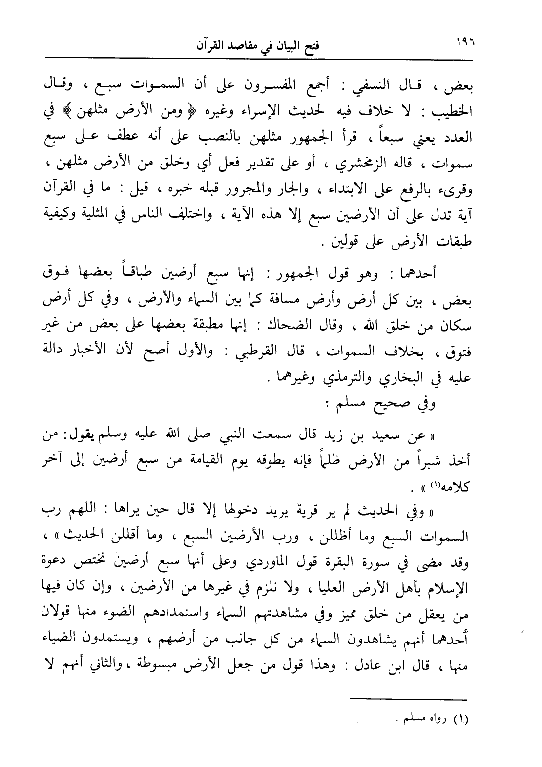 " وفي الحديث لم ير قرية يريد دخولها إلا قال حين يراها: اللهم رب السموات السبع وما أظللن، ورب الأرضين السبع، وما أقللن الحديث "، وقد مضى في سورة البقرة قول الماوردي وعلى أنها سبع أرضين تختص دعوة الإسلام بأهل الأرض العليا، ولا نلزم في غيرها من الأرضين، وإن كان فيها من يعقل من خلق مميز وفي مشاهدتهم السماء واستمدادهم الضوء منها قولان أحدهما أنهم يشاهدون السماء من كل جانب من أرضهم، ويستمدون الضياء منها، قال ابن عادل: وهذا قول من جعل الأرض مبسوطة، والثاني أنهم لا
