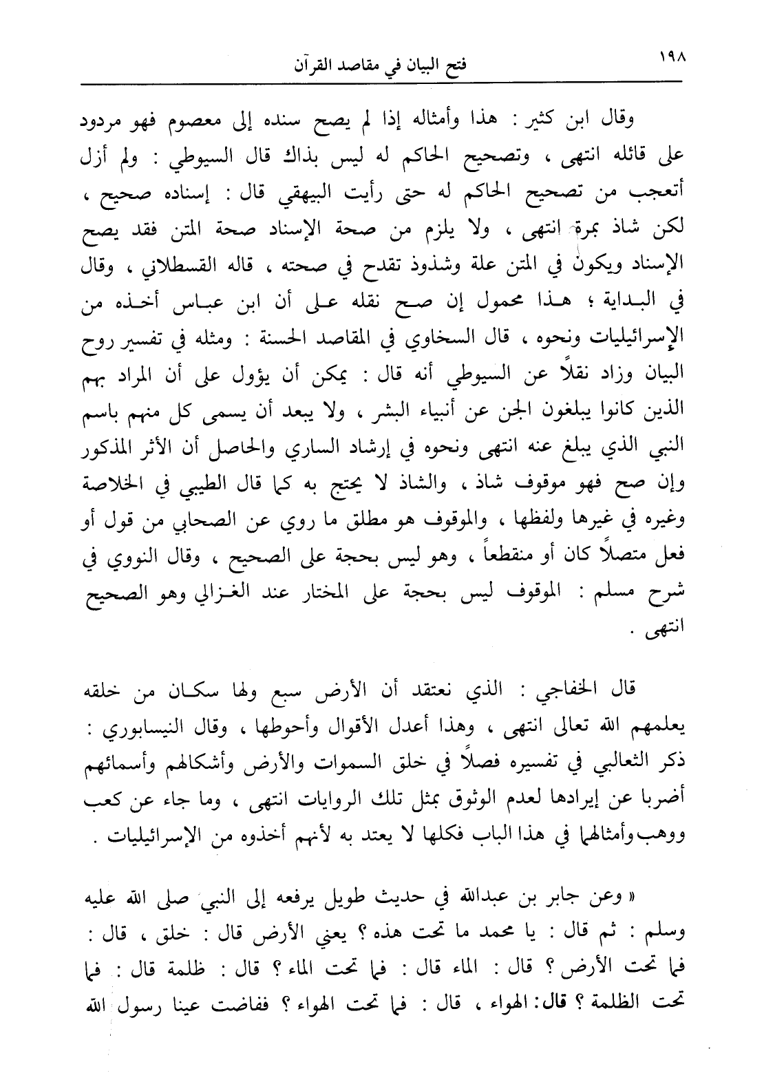 وقال ابن كثير: هذا وأمثاله إذا لم يصح سنده إلى معصوم فهو مردود على قائله انتهى، وتصحيح الحاكم له ليس بذاك قال السيوطي: ولم أزل أتعجب من تصحيح الحاكم له حتى رأيت البيهقي قال: إسناده صحيح، لكن شاذ بمرة انتهى، ولا يلزم من صحة الإسناد صحة المتن فقد يصح الإسناد ويكون في المتن علة وشذوذ تقدح في صحته، قاله القسطلاني، وقال في البداية؛ هذا محمول إن صح نقله على أن ابن عباس أخذه من الإسرائيليات ونحوه، قال السخاوي في المقاصد الحسنة: ومثله في تفسير روح البيان وزاد نقلاً عن السيوطي أنه قال: يمكن أن يؤول على أن المراد بهم الذين كانوا يبلغون الجن عن أنبياء البشر، ولا يبعد أن يسمى كل منهم باسم النبي الذي يبلغ عنه انتهى ونحوه في إرشاد الساري والحاصل أن الأثر المذكور وإن صح فهو موقوف شاذ، والشاذ لا يحتج به كما قال الطيبي في الخلاصة وغيره في غيرها ولفظها، والموقوف هو مطلق ما روي عن الصحابي من قول أو فعل متصلاً كان أو منقطعاً، وهو ليس بحجة على الصحيح، وقال النووي في شرح مسلم: الموقوف ليس بحجة على المختار عند الغزالي وهو الصحيح انتهى.