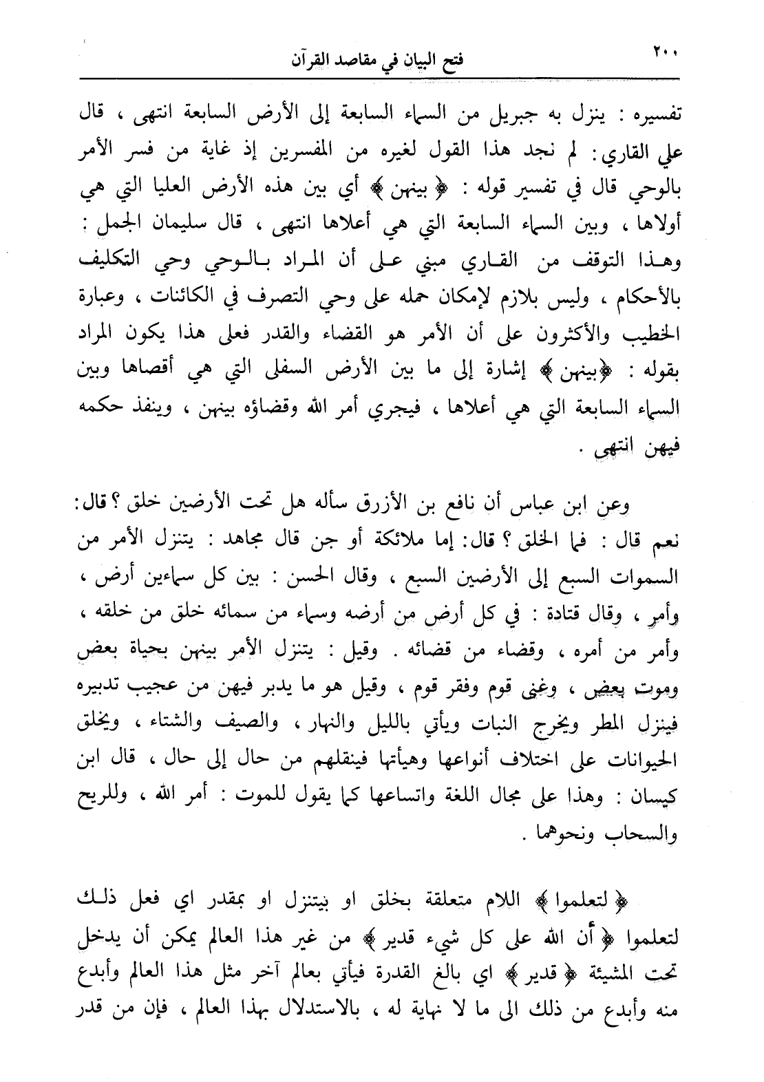 تفسيره: ينزل به جبريل من السماء السابعة إلى الأرض السابعة انتهى، قال علي القاري: لم نجد هذا القول لغيره من المفسرين إذ غاية من فسر الأمر بالوحي قال في تفسير قوله: (بينهن) أي بين هذه الأرض العليا التي هي أولاها، وبين السماء السابعة التي هي أعلاها انتهى، قال سليمان الجمل: وهذا التوقف من القاري مبني على أن المراد بالوحي وحي التكليف بالأحكام، وليس بلازم لإمكان حمله على وحي التصرف في الكائنات، وعبارة الخطيب والأكثرون على أن الأمر هو القضاء والقدر فعلى هذا يكون المراد بقوله: (بينهن) إشارة إلى ما بين الأرض السفلى التي هي أقصاها وبين السماء السابعة التي هي أعلاها، فيجري أمر الله وقضاؤه بينهن، وينفذ حكمه فيهن انتهى.
