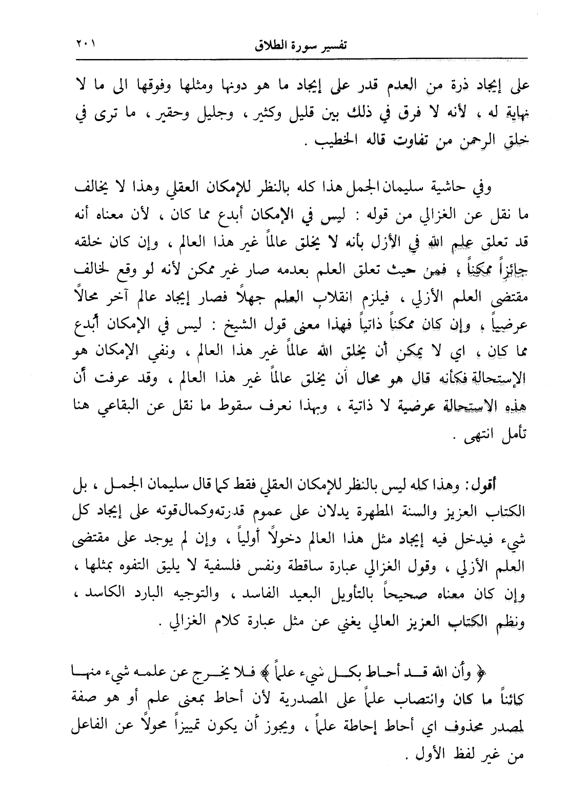 أقول: وهذا كله ليس بالنظر للإمكان العقلي فقط كما قال سليمان الجمل، بل الكتاب العزيز والسنة المطهرة يدلان على عموم قدرته وكمال قوته على إيجاد كل شيء فيدخل فيه إيجاد مثل هذا العالم دخولاً أولياً، وإن لم يوجد على مقتضى العلم الأزلي، وقول الغزالي عبارة ساقطة ونفس فلسفية لا يليق التفوه بمثلها، وإن كان معناه صحيحاً بالتأويل البعيد الفاسد، والتوجيه البارد الكاسد، ونظم الكتاب العزيز العالي يغني عن مثل عبارة كلام الغزالي.