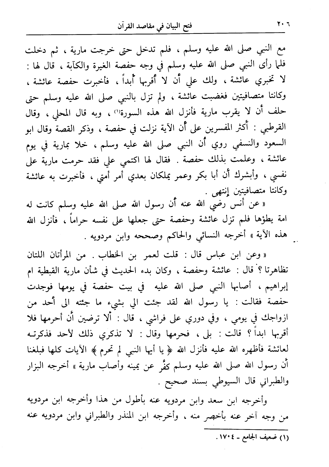 " وعن ابن عباس قال: قلت لعمر بن الخطاب. من المرأتان اللتان تظاهرتا؟ قال: عائشة وحفصة، وكان بدء الحديث في شأن مارية القبطية أم إبراهيم، أصابها النبي صلى الله عليه في بيت حفصة في يومها فوجدت حفصة فقالت: يا رسول الله لقد جئت إلي بشيء ما جئته إلى أحد من أزواجك في يومي، وفي دوري على فراشي، قال: ألا ترضين أن أحرمها فلا أقربها ابداً؟ قالت: بلى، فحرمها وقال: لا تذكري ذلك لأحد فذكرته لعائشة فأظهره الله عليه فأنزل الله (يا أيها النبي لم تحرم) الآيات كلها فبلغنا أن رسول الله صلى الله عليه وسلم كفَّر عن يمينه وأصاب مارية " أخرجه البزار والطبراني قال السيوطي بسند صحيح.