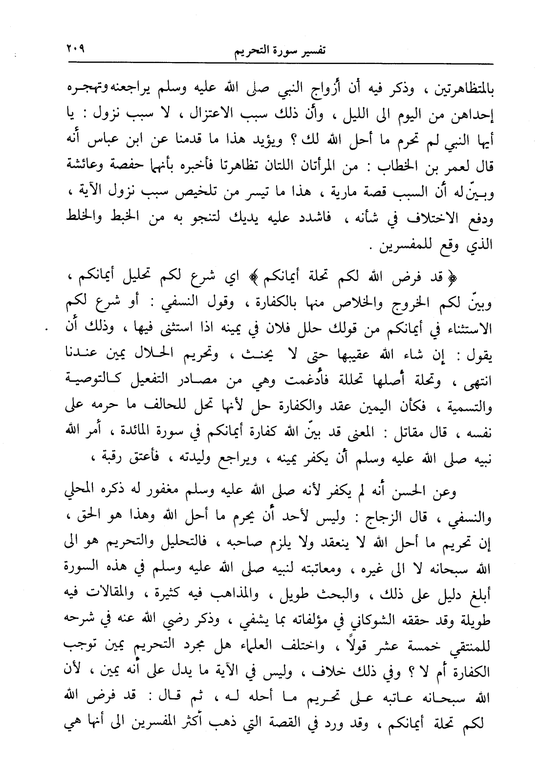 بالمتظاهرتين، وذكر فيه أن أزواج النبي صلى الله عليه وسلم يراجعنه وتهجره إحداهن من اليوم إلى الليل، وأن ذلك سبب الاعتزال، لا سبب نزول: يا أيها النبي لم تحرم ما أحل الله لك؟ ويؤيد هذا ما قدمنا عن ابن عباس أنه قال لعمر بن الخطاب: من المرأتان اللتان تظاهرتا فأخبره بأنهما حفصة وعائشة وبينّ له أن السبب قصة مارية، هذا ما تيسر من تلخيص سبب نزول الآية، ودفع الاختلاف في شأنه، فاشدد عليه يديك لتنجو به من الخبط والخلط الذي وقع للمفسرين.
