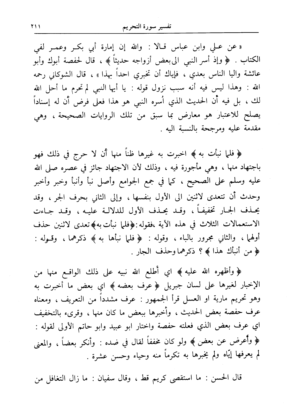 (وإذ أسر النبي إلى بعض أزواجه حديثاً)، قال لحفصة أبوك وأبو عائشة واليا الناس بعدي، فإياك أن تخبري أحداً بهذا "، قال الشوكاني رحمه الله: وهذا ليس فيه أنه سبب نزول قوله: يا أيها النبي لم تحرم ما أحل الله لك، بل فيه أن الحديث الذي أسره النبي هو هذا فعلى فرض أن له إسناداً يصلح للاعتبار هو معارض بما سبق من تلك الروايات الصحيحة، وهي مقدمة عليه ومرجحة بالنسبة إليه.