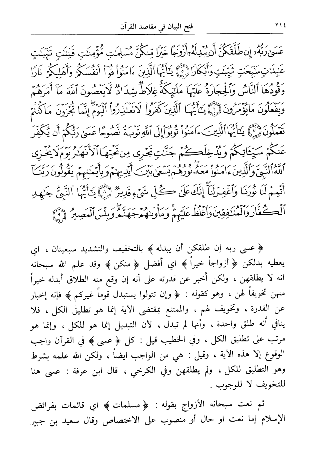 عَسَى رَبُّهُ إِنْ طَلَّقَكُنَّ أَنْ يُبْدِلَهُ أَزْوَاجًا خَيْرًا مِنْكُنَّ مُسْلِمَاتٍ مُؤْمِنَاتٍ قَانِتَاتٍ تَائِبَاتٍ عَابِدَاتٍ سَائِحَاتٍ ثَيِّبَاتٍ وَأَبْكَارًا (5) يَا أَيُّهَا الَّذِينَ آمَنُوا قُوا أَنْفُسَكُمْ وَأَهْلِيكُمْ نَارًا وَقُودُهَا النَّاسُ وَالْحِجَارَةُ عَلَيْهَا مَلَائِكَةٌ غِلَاظٌ شِدَادٌ لَا يَعْصُونَ اللَّهَ مَا أَمَرَهُمْ وَيَفْعَلُونَ مَا يُؤْمَرُونَ (6) يَا أَيُّهَا الَّذِينَ كَفَرُوا لَا تَعْتَذِرُوا الْيَوْمَ إِنَّمَا تُجْزَوْنَ مَا كُنْتُمْ تَعْمَلُونَ (7) يَا أَيُّهَا الَّذِينَ آمَنُوا تُوبُوا إِلَى اللَّهِ تَوْبَةً نَصُوحًا عَسَى رَبُّكُمْ أَنْ يُكَفِّرَ عَنْكُمْ سَيِّئَاتِكُمْ وَيُدْخِلَكُمْ جَنَّاتٍ تَجْرِي مِنْ تَحْتِهَا الْأَنْهَارُ يَوْمَ لَا يُخْزِي اللَّهُ النَّبِيَّ وَالَّذِينَ آمَنُوا مَعَهُ نُورُهُمْ يَسْعَى بَيْنَ أَيْدِيهِمْ وَبِأَيْمَانِهِمْ يَقُولُونَ رَبَّنَا أَتْمِمْ لَنَا نُورَنَا وَاغْفِرْ لَنَا إِنَّكَ عَلَى كُلِّ شَيْءٍ قَدِيرٌ (8) يَا أَيُّهَا النَّبِيُّ جَاهِدِ الْكُفَّارَ وَالْمُنَافِقِينَ وَاغْلُظْ عَلَيْهِمْ وَمَأْوَاهُمْ جَهَنَّمُ وَبِئْسَ الْمَصِيرُ (9)