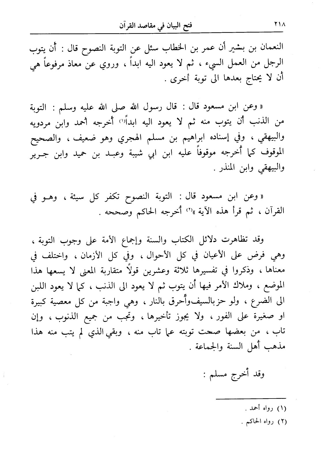 " وعن ابن مسعود قال: قال رسول الله صلى الله عليه وسلم: التوبة من الذنب أن يتوب منه ثم لا يعود إليه أبداً (¬1) أخرجه أحمد وابن مردويه والبيهقي، وفي إسناده إبراهيم بن مسلم الهجري وهو ضعيف، والصحيح الموقوف كما أخرجه موقوفاً عليه ابن أبي شيبة وعبد بن حميد وابن جرير والبيهقي وابن المنذر.
