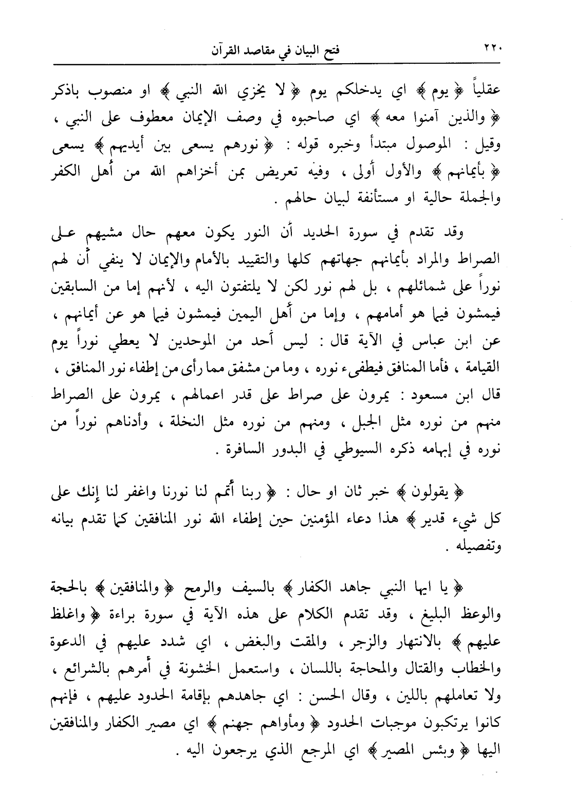 وقد تقدم في سورة الحديد أن النور يكون معهم حال مشيهم على الصراط والمراد بأيمانهم جهاتهم كلها والتقييد بالأمام والإيمان لا ينفي أن لهم نوراً على شمائلهم، بل لهم نور لكن لا يلتفتون إليه، لأنهم إما من السابقين فيمشون فيما هو أمامهم، وإما من أهل اليمين فيمشون فيما هو عن أيمانهم، عن ابن عباس في الآية قال: ليس أحد من الموحدين لا يعطي نوراً يوم القيامة، فأما المنافق فيطفىء نوره، وما من مشفق مما رأى من إطفاء نور المنافق، قال ابن مسعود: يمرون على صراط على قدر أعمالهم، يمرون على الصراط منهم من نوره مثل الجبل، ومنهم من نوره مثل النخلة، وأدناهم نوراً من نوره في إبهامه ذكره السيوطي في البدور السافرة.