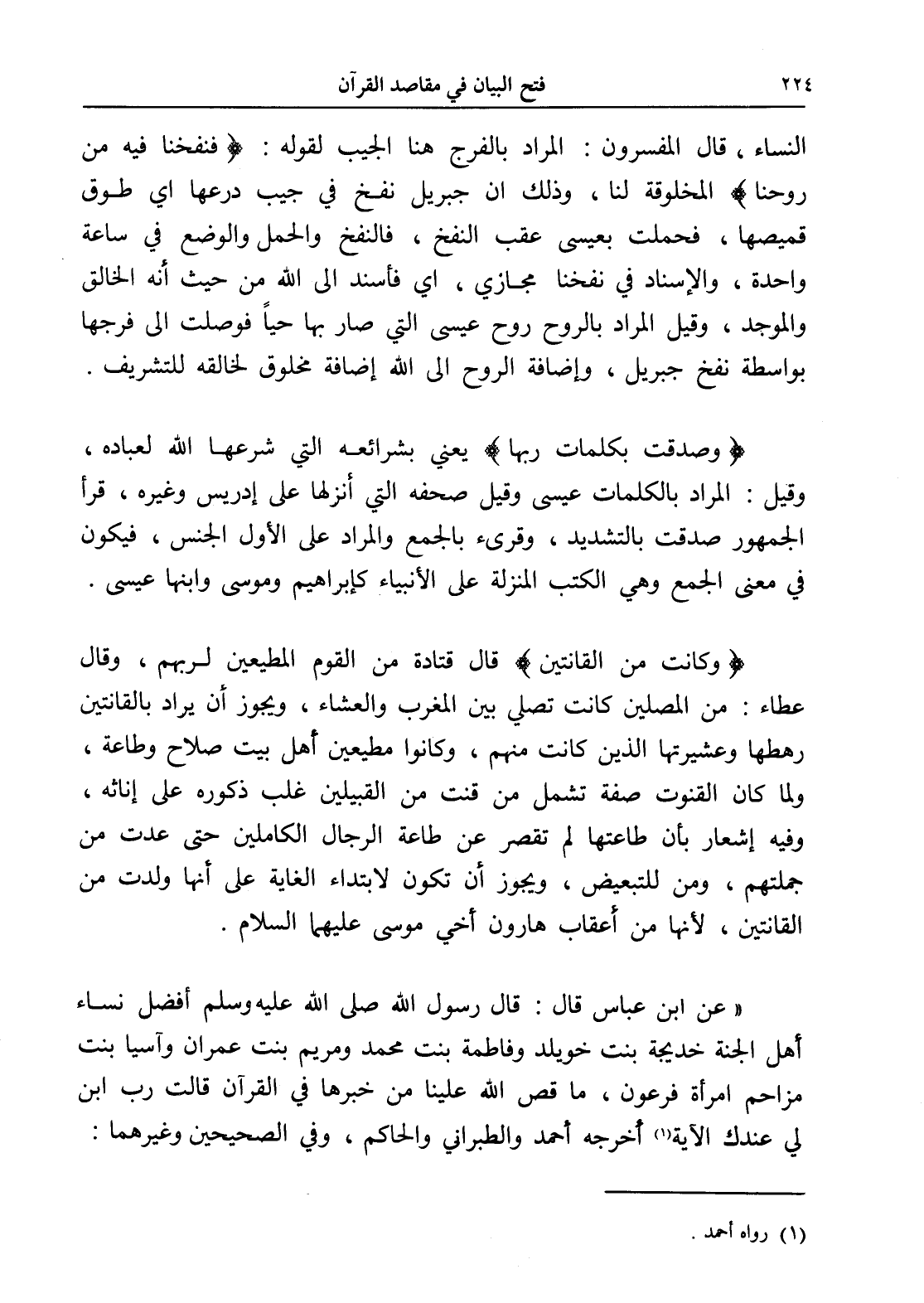 " عن ابن عباس قال: قال رسول الله صلى الله عليه وسلم أفضل نساء أهل الجنة خديجة بنت خويلد وفاطمة بنت محمد ومريم بنت عمران وآسيا بنت مزاحم امرأة فرعون، ما قص الله علينا من خبرها في القرآن قالت رب ابن لي عندك الآية (¬1) أخرجه أحمد والطبراني والحاكم، وفي الصحيحين وغيرهما: