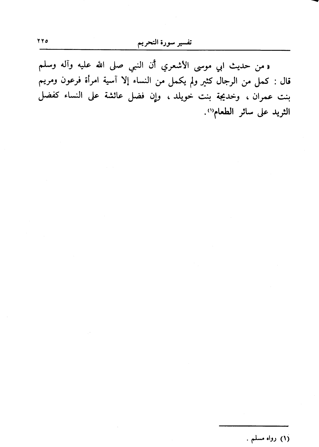 " من حديث أبي موسى الأشعري أن النبي صلى الله عليه وآله وسلم قال: كمل من الرجال كثير ولم يكمل من النساء إلا آسية امرأة فرعون ومريم بنت عمران، وخديجة بنت خويلد، وإن فضل عائشة على النساء كفضل الثريد على سائر الطعام " (¬1).