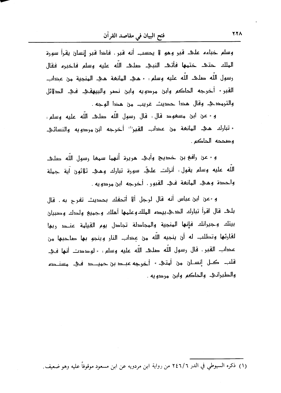 وعن ابن مسعود قال: قال رسول الله - صلى الله عليه وسلم -: " تبارك هي المانعة من عذاب القبر " (¬1) أخرجه ابن مردويه والنسائي وصححه الحاكم.