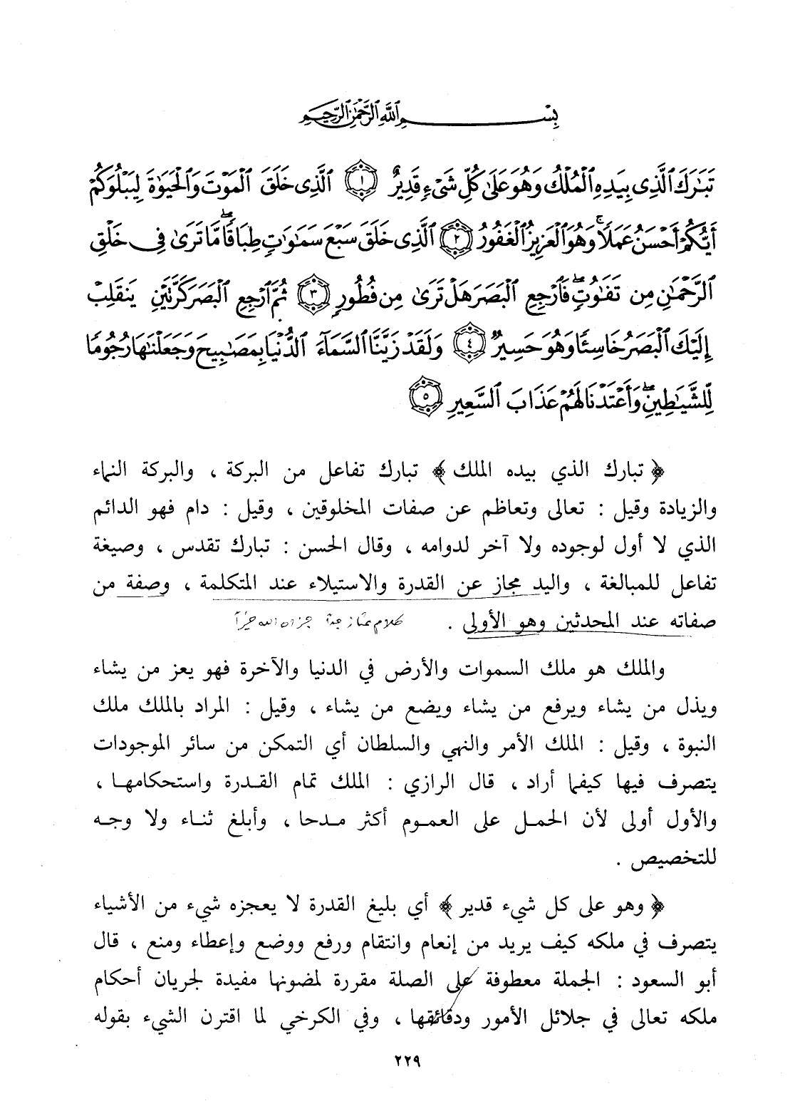تَبَارَكَ الَّذِي بِيَدِهِ الْمُلْكُ وَهُوَ عَلَى كُلِّ شَيْءٍ قَدِيرٌ (1) الَّذِي خَلَقَ الْمَوْتَ وَالْحَيَاةَ لِيَبْلُوَكُمْ أَيُّكُمْ أَحْسَنُ عَمَلًا وَهُوَ الْعَزِيزُ الْغَفُورُ (2) الَّذِي خَلَقَ سَبْعَ سَمَاوَاتٍ طِبَاقًا مَا تَرَى فِي خَلْقِ الرَّحْمَنِ مِنْ تَفَاوُتٍ فَارْجِعِ الْبَصَرَ هَلْ تَرَى مِنْ فُطُورٍ (3) ثُمَّ ارْجِعِ الْبَصَرَ كَرَّتَيْنِ يَنْقَلِبْ إِلَيْكَ الْبَصَرُ خَاسِئًا وَهُوَ حَسِيرٌ (4) وَلَقَدْ زَيَّنَّا السَّمَاءَ الدُّنْيَا بِمَصَابِيحَ وَجَعَلْنَاهَا رُجُومًا لِلشَّيَاطِينِ وَأَعْتَدْنَا لَهُمْ عَذَابَ السَّعِيرِ (5)