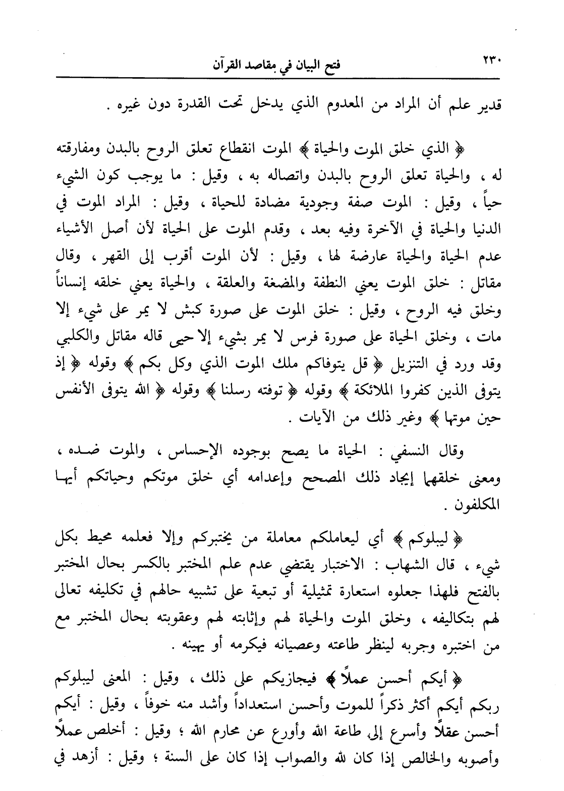 (الذي خلق الموت والحياة) الموت انقطاع تعلق الروح بالبدن ومفارقته له، والحياة تعلق الروح بالبدن واتصاله به، وقيل: ما يوجب كون الشيء حياً، وقيل: الموت صفة وجودية مضادة للحياة، وقيل: المراد الموت في الدنيا والحياة في الآخرة وفيه بعد، وقدم الموت على الحياة لأن أصل الأشياء عدم الحياة والحياة عارضة لها، وقيل: لأن الموت أقرب إلى القهر، وقال مقاتل: خلق الموت يعني النطفة والمضغة والعلقة، والحياة يعني خلقه إنساناً وخلق فيه الروح، وقيل: خلق الموت على صورة كبش لا يمر على شيء إلا مات، وخلق الحياة على صورة فرس لا يمر بشيء إلا حيى قاله مقاتل والكلبي وقد ورد في التنزيل (قل يتوفاكم ملك الموت الذي وكل بكم) وقوله (إذ يتوفى الذين كفروا الملائكة) وقوله (توفته رسلنا) وقوله (الله يتوفى الأنفس حين موتها) وغير ذلك من الآيات.