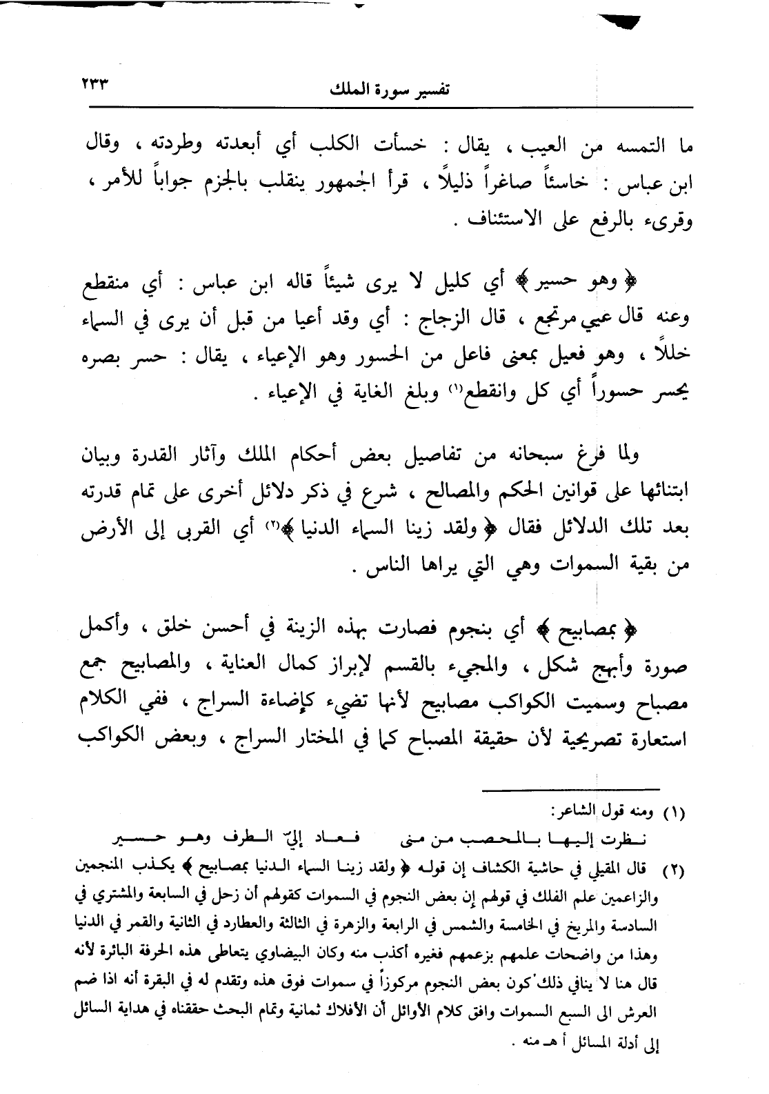 (¬1) قال المقيلي في حاشية الكشاف إن قوله (ولقد زينا السماء الدنيا بمصابيح) يكذب المنجمين والزاعمين علم الفلك في قولهم إن بعض النجوم في السموات كقولهم أن زحل في السابعة والمشتري في السادسة والمريخ في الخامسة والشمس في الرابعة والزهرة في الثالثة والعطارد في الثانية والقمر في الدنيا وهذا من واضحات علمهم بزعمهم فغيره أكذب منه وكان البيضاوي يتعاطى هذه الحرفة البائرة لأنه قال هنا لا ينافي ذلك كون بعض النجوم مركوزاً في سموات فوق هذه وتقدم له في البقرة أنه إذا ضم العرش إلى السبع السموات وافق كلام الأوائل أن الأفلاك ثمانية وتمام البحث حققناه في هداية السائل إلى أدلة المسائل أهـ منه.