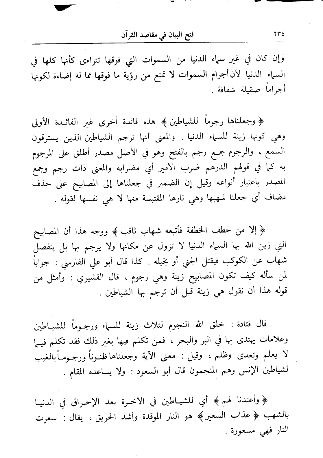 (إلا من خطف الخطفة فأتبعه شهاب ثاقب) ووجه هذا أن المصابيح التي زين الله بها السماء الدنيا لا تزول عن مكانها ولا يرجم بها بل ينفصل شهاب عن الكوكب فيقتل الجني أو يخبله. كذا قال أبو علي الفارسي: جواباً لمن سأله كيف تكون المصابيح زينة وهي رجوم، قال القشيري: وأمثل من قوله هذا أن نقول هي زينة قبل أن ترجم بها الشياطين.