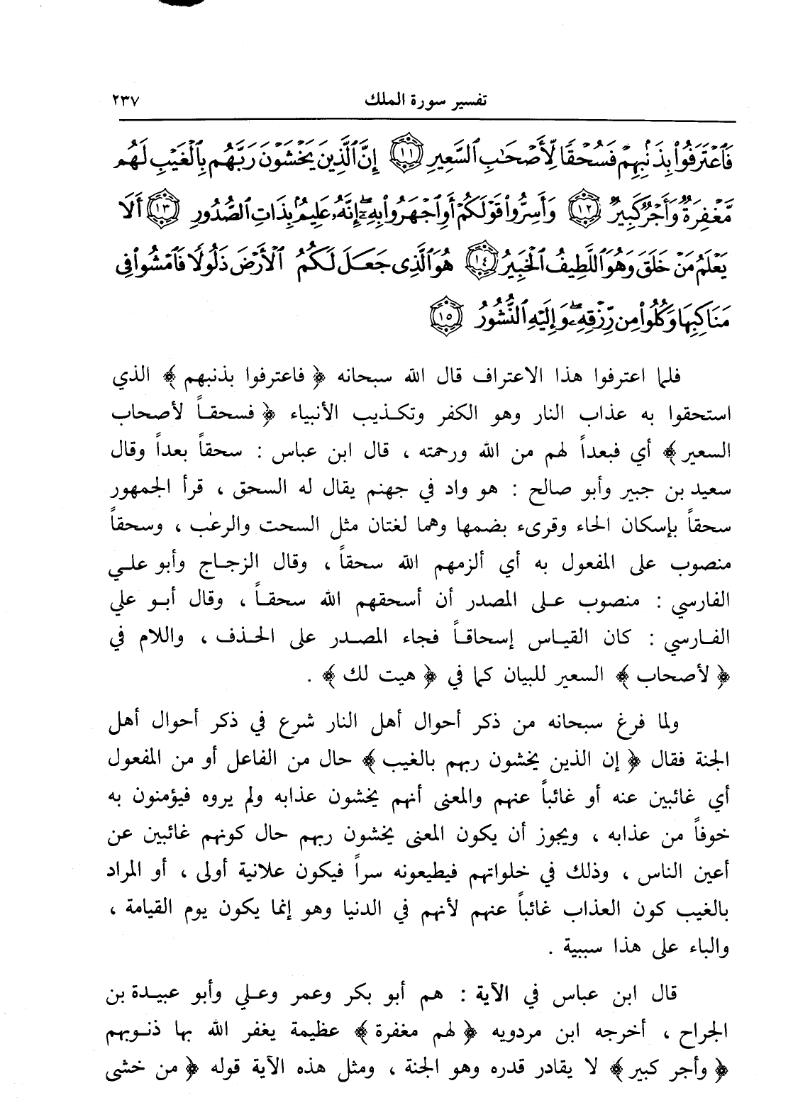 فَاعْتَرَفُوا بِذَنْبِهِمْ فَسُحْقًا لِأَصْحَابِ السَّعِيرِ (11) إِنَّ الَّذِينَ يَخْشَوْنَ رَبَّهُمْ بِالْغَيْبِ لَهُمْ مَغْفِرَةٌ وَأَجْرٌ كَبِيرٌ (12) وَأَسِرُّوا قَوْلَكُمْ أَوِ اجْهَرُوا بِهِ إِنَّهُ عَلِيمٌ بِذَاتِ الصُّدُورِ (13) أَلَا يَعْلَمُ مَنْ خَلَقَ وَهُوَ اللَّطِيفُ الْخَبِيرُ (14) هُوَ الَّذِي جَعَلَ لَكُمُ الْأَرْضَ ذَلُولًا فَامْشُوا فِي مَنَاكِبِهَا وَكُلُوا مِنْ رِزْقِهِ وَإِلَيْهِ النُّشُورُ (15)