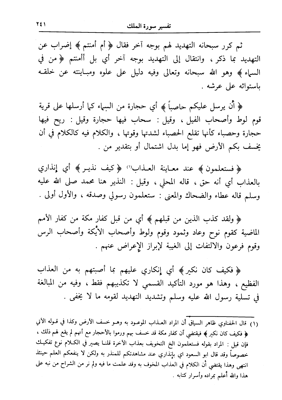 (¬1) قال الحفناوي ظاهر السياق أن المراد العذاب الموعود به وهو خسف الأرض وكذا في قوله الآتي (فكيف كان نكير) فيقتضي أن كفار مكة قد خسف بهم ورموا بالأحجار مع أنهم لم يقع لهم ذلك، فإن قيل: المراد بقوله فستعلمون الخ التخويف بعذاب الآخرة قلنا يصير في الكلام نوع تفكيك خصوصاً وقد قال أبو السعود أي بإنذاري عند مشاهدتكم للمنذر به ولكن لا ينفعكم العلم حينئذ انتهى وهذا يقتضي أن الكلام في العذاب المخوف به وقد علمت ما فيه ولم نر من الشراح من نبه على هذا والله أعلم بمراده وأسرار كتابه.