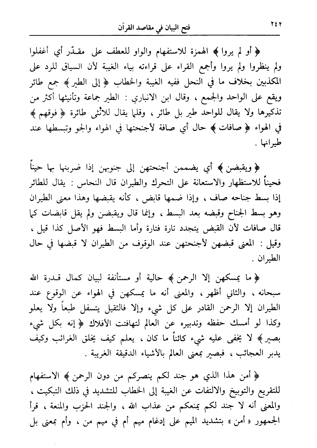 (أو لم يروا) الهمزة للاستفهام والواو للعطف على مقدّر أي أغفلوا ولم ينظروا ولم يروا وأجمع القراء على قراءته بياء الغيبة لأن السياق للرد على المكذبين بخلاف ما في النحل ففيه الغيبة والخطاب (إلى الطير) جمع طائر ويقع على الواحد والجمع، وقال ابن الأنباري: الطير جماعة وتأنيثها أكثر من تذكيرها ولا يقال للواحد طير بل طائر، وقلما يقال للأنثى طائرة (فوقهم) في الهواء (صافات) حال أي صافة لأجنحتها في الهواء والجو وتبسطها عند طيرانها.