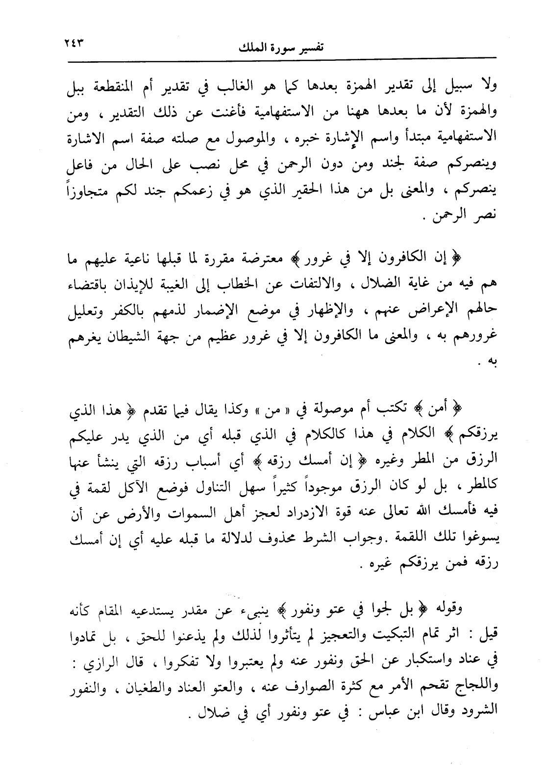 (أمن) تكتب أم موصولة في " من " وكذا يقال فيما تقدم (هذا الذي يرزقكم) الكلام في هذا كالكلام في الذي قبله أي من الذي يدر عليكم الرزق من المطر وغيره (إن أمسك رزقه) أي أسباب رزقه التي ينشأ عنها كالمطر، بل لو كان الرزق موجوداً كثيراً سهل التناول فوضع الآكل لقمة في فيه فأمسك الله تعالى عنه قوة الإزدراد لعجز أهل السموات والأرض عن أن يسوغوا تلك اللقمة. وجواب الشرط محذوف لدلالة ما قبله عليه أي إن أمسك رزقه فمن يرزقكم غيره.
