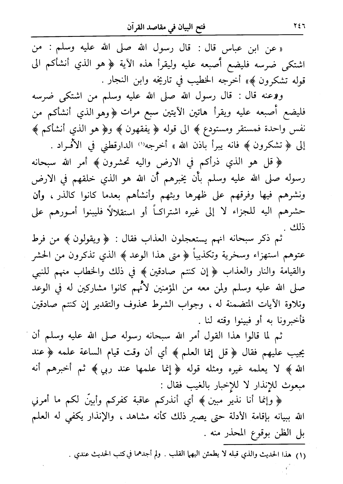 " عن ابن عباس قال: قال رسول الله صلى الله عليه وسلم: من اشتكى ضرسه فليضع إصبعه عليه وليقرأ هذه الآية (هو الذي أنشأكم -إلى قوله- تشكرون) " أخرجه الخطيب في تاريخه وابن النجار.