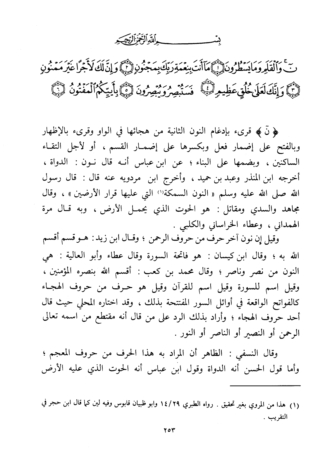 (ن) قرىء بإدغام النون الثانية من هجائها في الواو وقرىء بالإظهار وبالفتح على إضمار فعل وبكسرها على إضمار القسم، أو لأجل التقاء الساكنين، وبضمها على البناء؛ عن ابن عباس أنه قال نون: الدواة، أخرجه ابن المنذر وعبد بن حميد، وأخرج ابن مردويه عنه قال: قال رسول الله صلى الله عليه وسلم " النون السمكة (¬1) التي عليها قرار الأرضين "، وقال مجاهد والسدي ومقاتل: هو الحوت الذي يحمل الأرض، وبه قال مرة الهمداني، وعطاء الخراساني والكلبي.