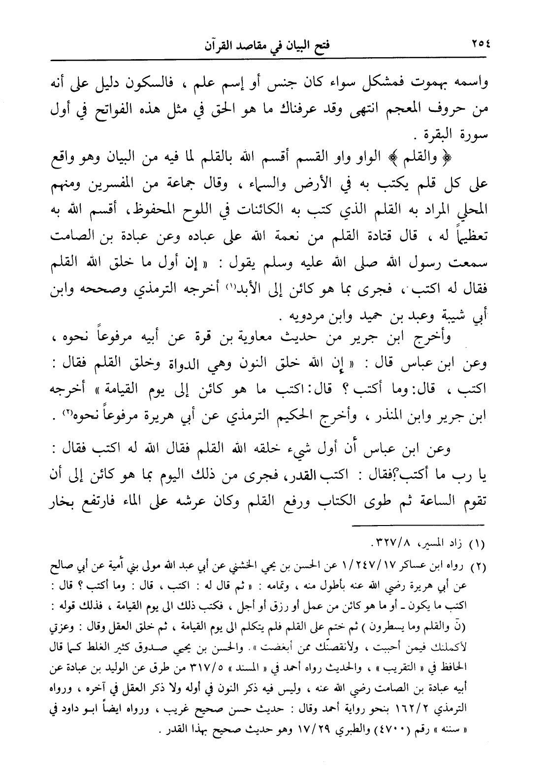 وأخرج ابن جرير من حديث معاوية بن قرة عن أبيه مرفوعاً نحوه، وعن ابن عباس قال: " إن الله خلق النون وهي الدواة وخلق القلم فقال: اكتب، قال: وما أكتب؟ قال: اكتب ما هو كائن إلى يوم القيامة " أخرجه ابن جرير وابن المنذر، وأخرج الحكيم الترمذي عن أبي هريرة مرفوعاً نحوه (¬2).