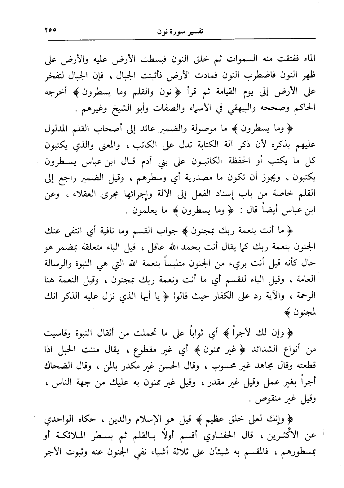 الماء ففتقت منه السموات ثم خلق النون فبسطت الأرض عليه والأرض على ظهر النون فاضطرب النون فمادت الأرض فأثبتت الجبال، فإن الجبال لتفخر على الأرض إلى يوم القيامة ثم قرأ (ن وَالْقَلَمِ وَمَا يَسْطُرُونَ) أخرجه الحاكم وصححه والبيهقي في الأسماء والصفات وأبو الشيخ وغيرهم.